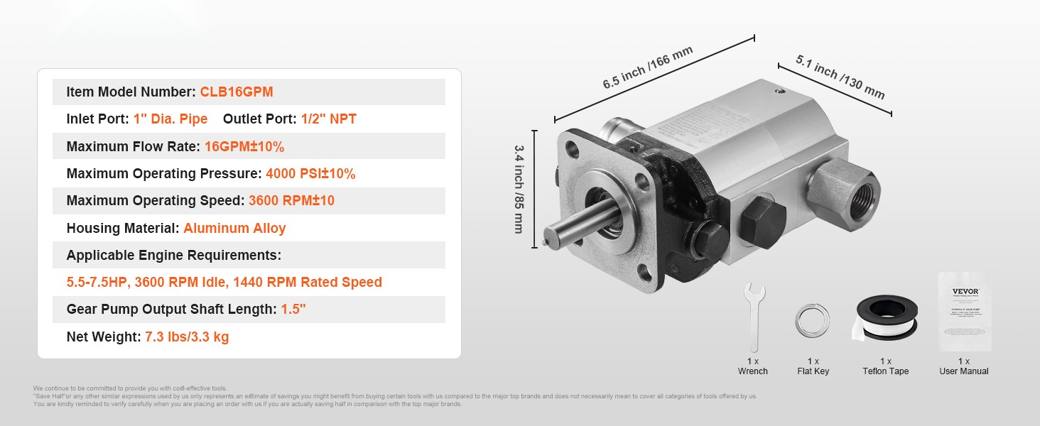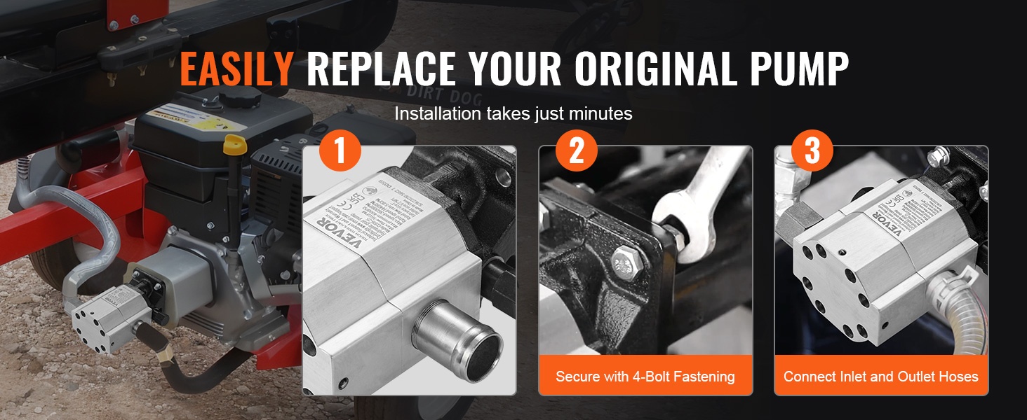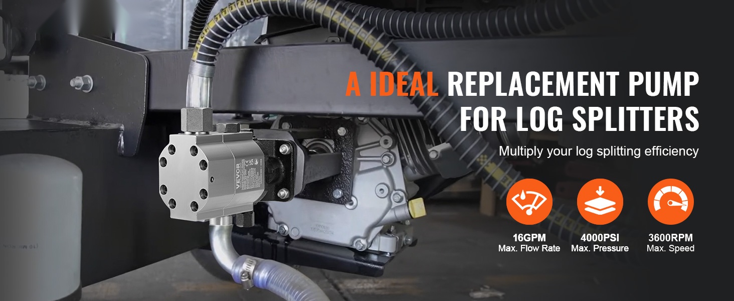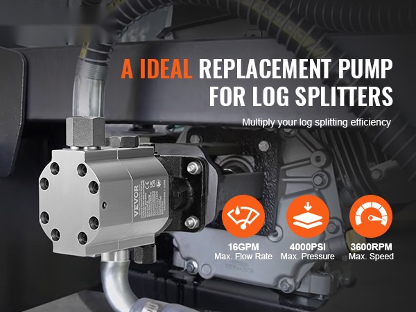 Hydraulinen hammaspyöräpumppu on valmistettu korroosionkestävästä alumiiniseoksesta. Virtaus on 13GPM ja suurin käyttöpaine 3000 PSI, joten pumppu soveltuu erilaisten puulajien tehokkaaseen halkaisuun ja muuhun puunkäsittelyyn.