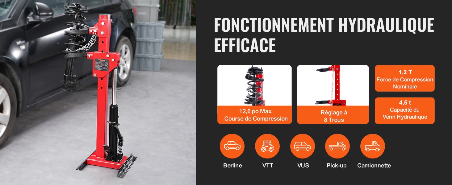 Hydraulinen rakenne vähentää fyysistä rasitusta ja tekee työskentelystä tasaisempaa. Laaja puristusalue sopii useiden ajoneuvotyyppien kierrejousille, ja tukeva rakenne auttaa pitämään työn vakaana.