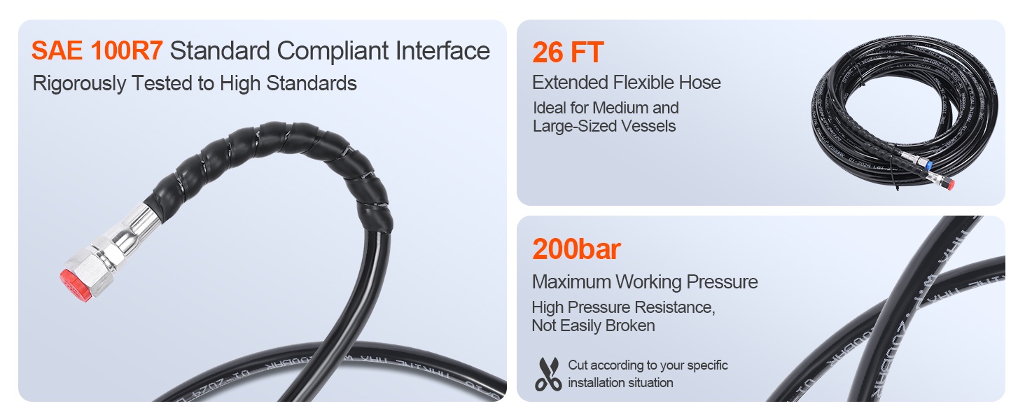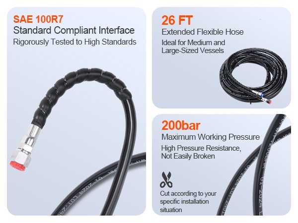 - Kiinteän pituinen 26 ft hydrauliletku, jonka voi katkaista sopivaksi