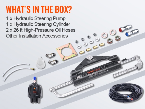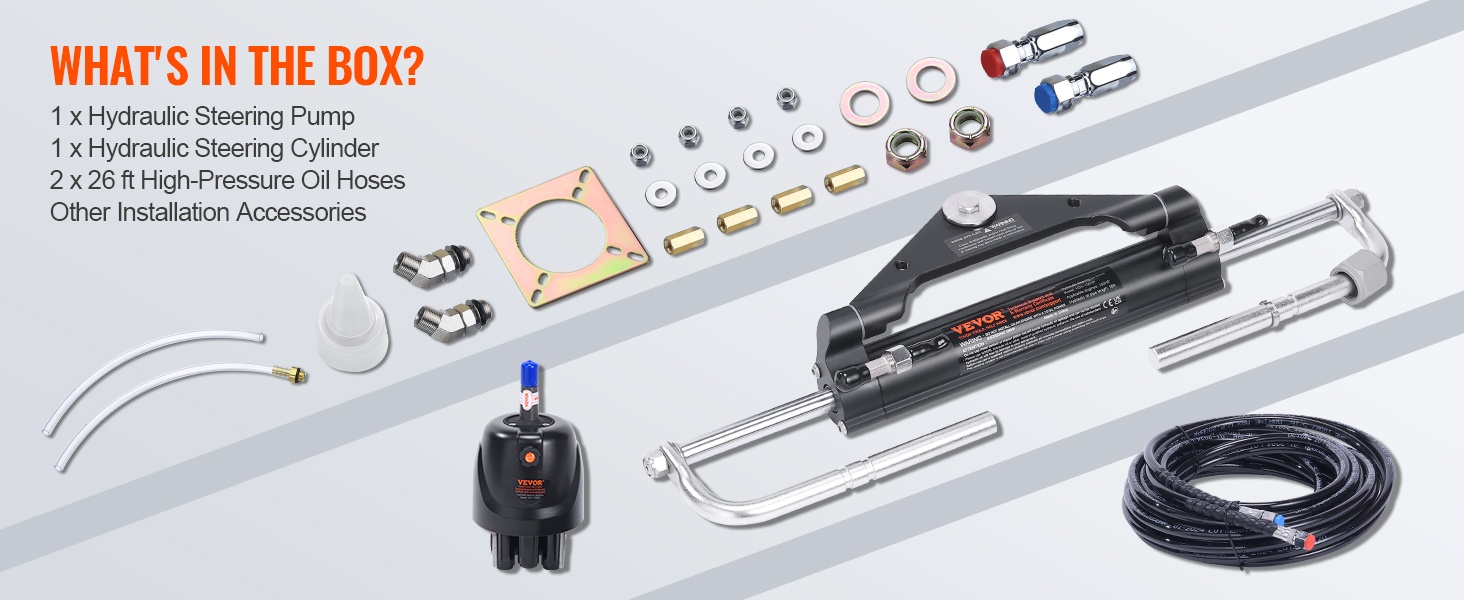 Hydraulinen ohjaussarja sisältää kaiken perusasennukseen tarvittavan: hydraulisen ohjaussylinterin, hydraulipumpun, kaksi 26 ft hydrauliletkua sekä kattavan tarvikesarjan kiinnitystä ja käyttöönottoa varten.