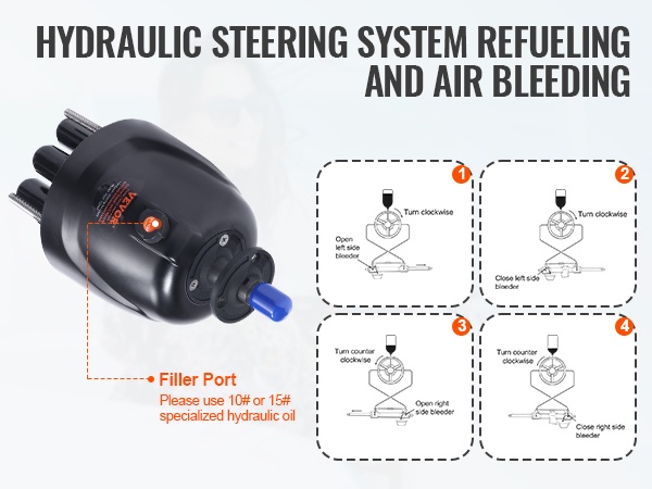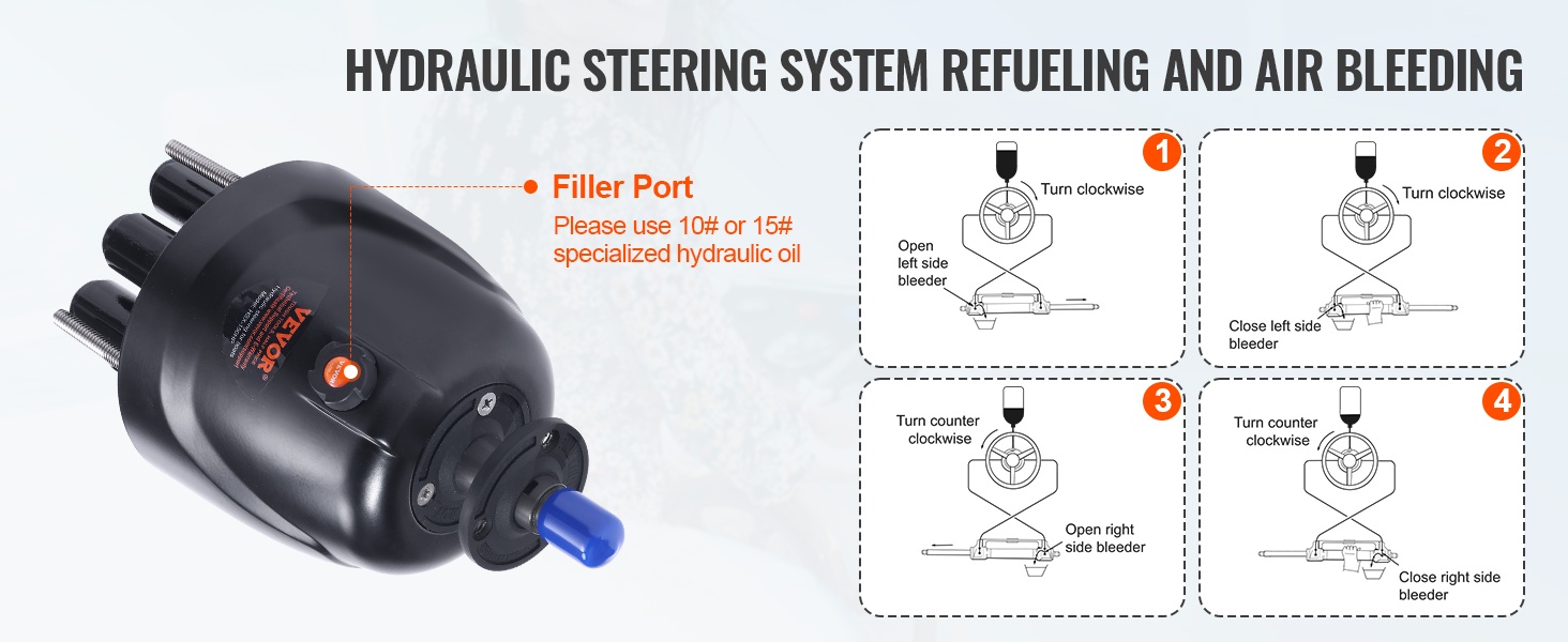 Ennen käyttöönottoa järjestelmä tulee täyttää öljyllä ja ilmata huolellisesti. Jos ohjaus tuntuu viiveiseltä tai teho heikkenee, hydraulic-nesteen määrä ja kunto on syytä tarkistaa ja järjestelmä ilmata uudelleen. Käyttöohjeen noudattaminen on tärkeää turvallisen ja pitkäikäisen käytön varmistamiseksi.