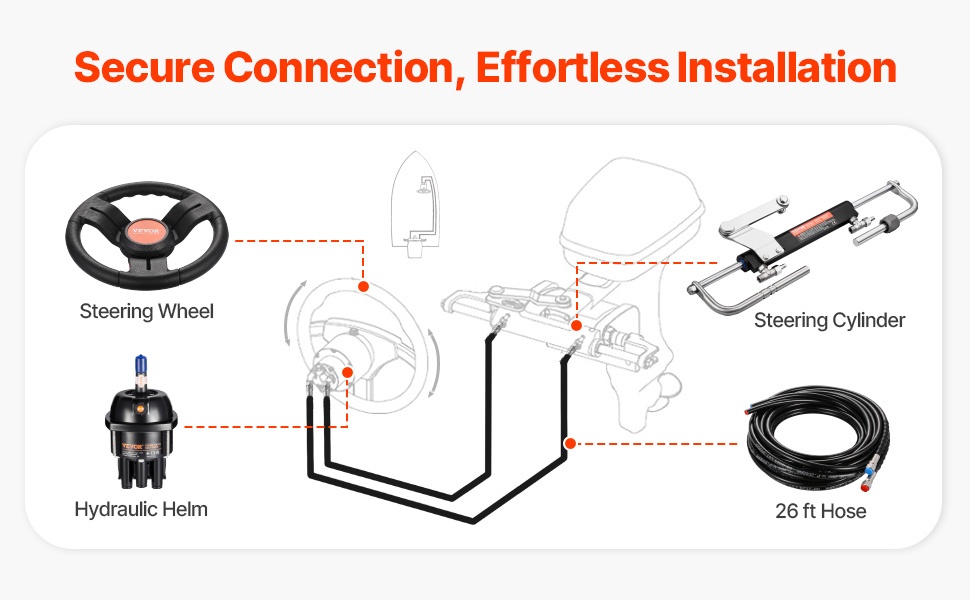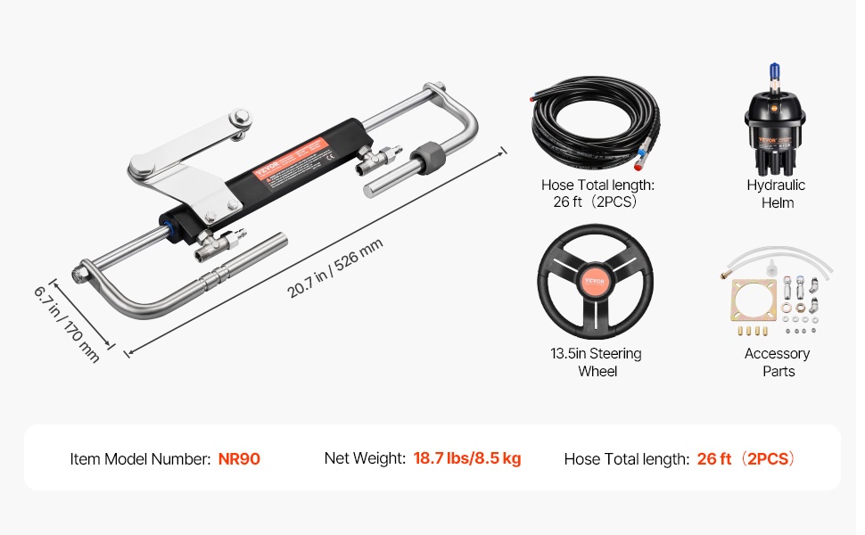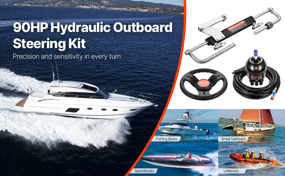 Hydraulinen perämoottorin ohjauspakkaus tarjoaa joustavan ja tarkan ohjauksen jopa 90HP perämoottorilla varustettuihin veneisiin. Pakkaus sisältää hydraulisen ohjauspumpun, hydraulisylinterin, 13.5-tuumaisen ohjauspyörän, 2 kpl 26FT hydrauliletkua sekä tarvittavat asennustarvikkeet.