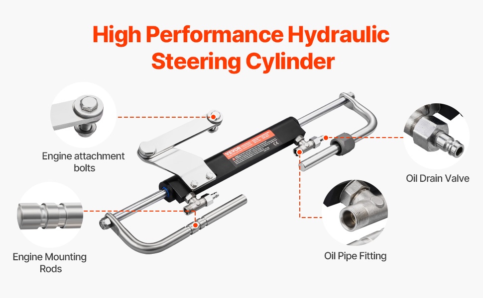 Hydraulinen ohjaussylinteri on suunniteltu tarkkaan ja pitkäikäiseen käyttöön. Moottorin kiinnityspultit ja moottorin kiinnitystangot varmistavat tukevan ja turvallisen asennuksen. Öljyn tyhjennysventtiili ja öljyliitin helpottavat öljyn virtausta ja järjestelmän huoltoa.