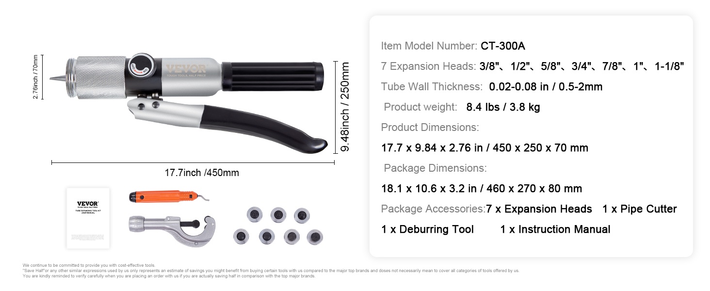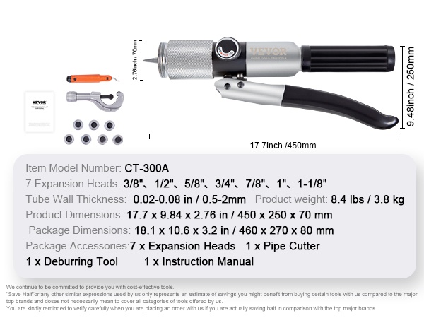 Hydraulinen putkenlaajennin 7 laajennuspäätä 3/8-1-1/8 tuumaa kuparille alumiinille messingille pehmeälle teräkselle