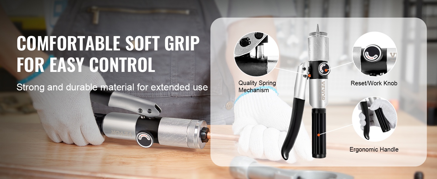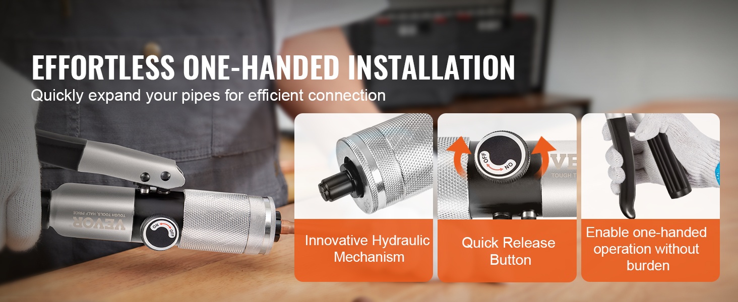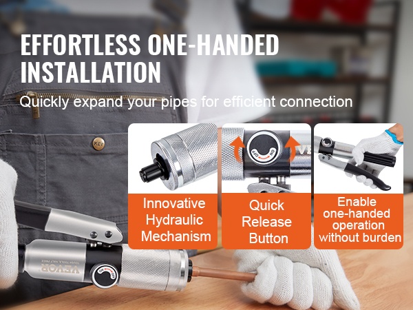 Hydraulinen mekanismi ja kätevä vapautuspainike mahdollistavat hallitun ja sulavan laajennuksen jopa yhdellä kädellä. Paine jakautuu tasaisesti, mikä auttaa saamaan tiiviin ja siistin liitoksen.