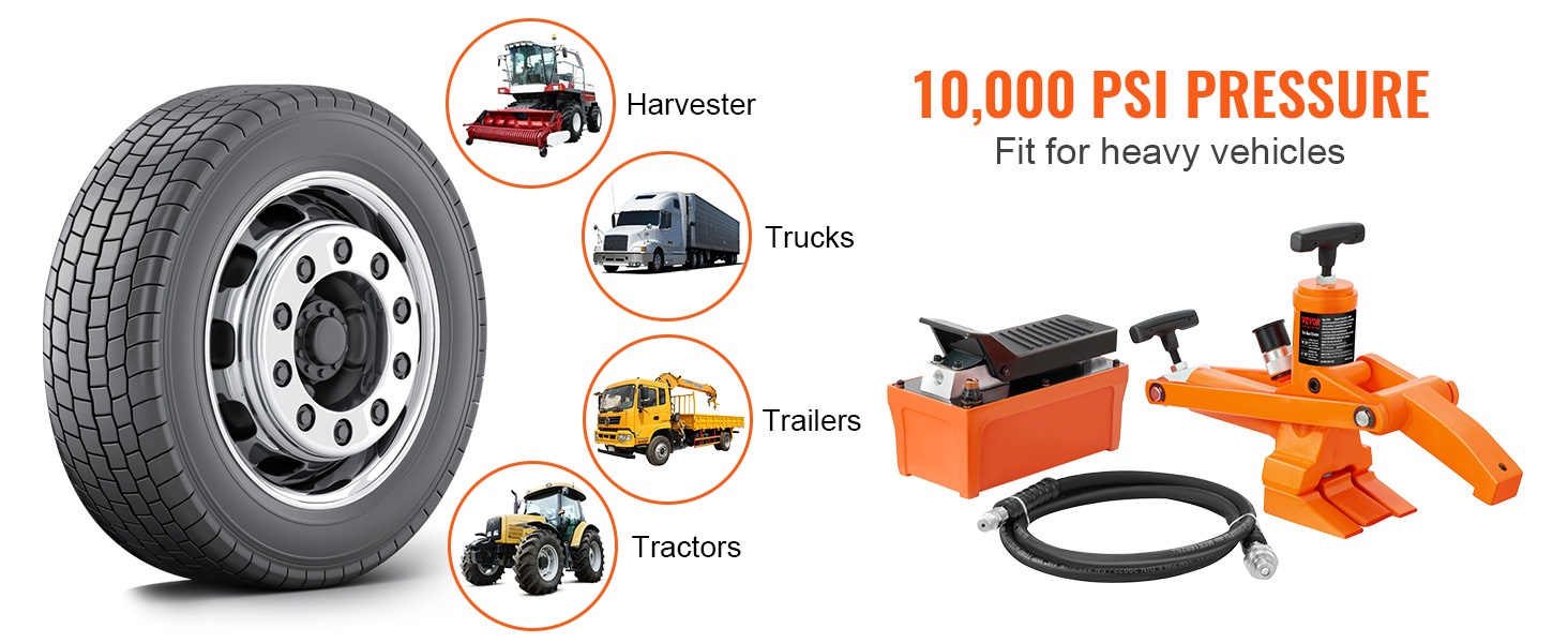 Hydraulinen bead breaker, jonka voima on 1000 psi, soveltuu useille ajoneuvoluokille, kuten henkilöautoille, kuorma-autoille, katumaastureille ja maatalouskoneille. Se tuo joustavuutta ja tehokkuutta renkaiden huolto- ja vaihtotöihin.