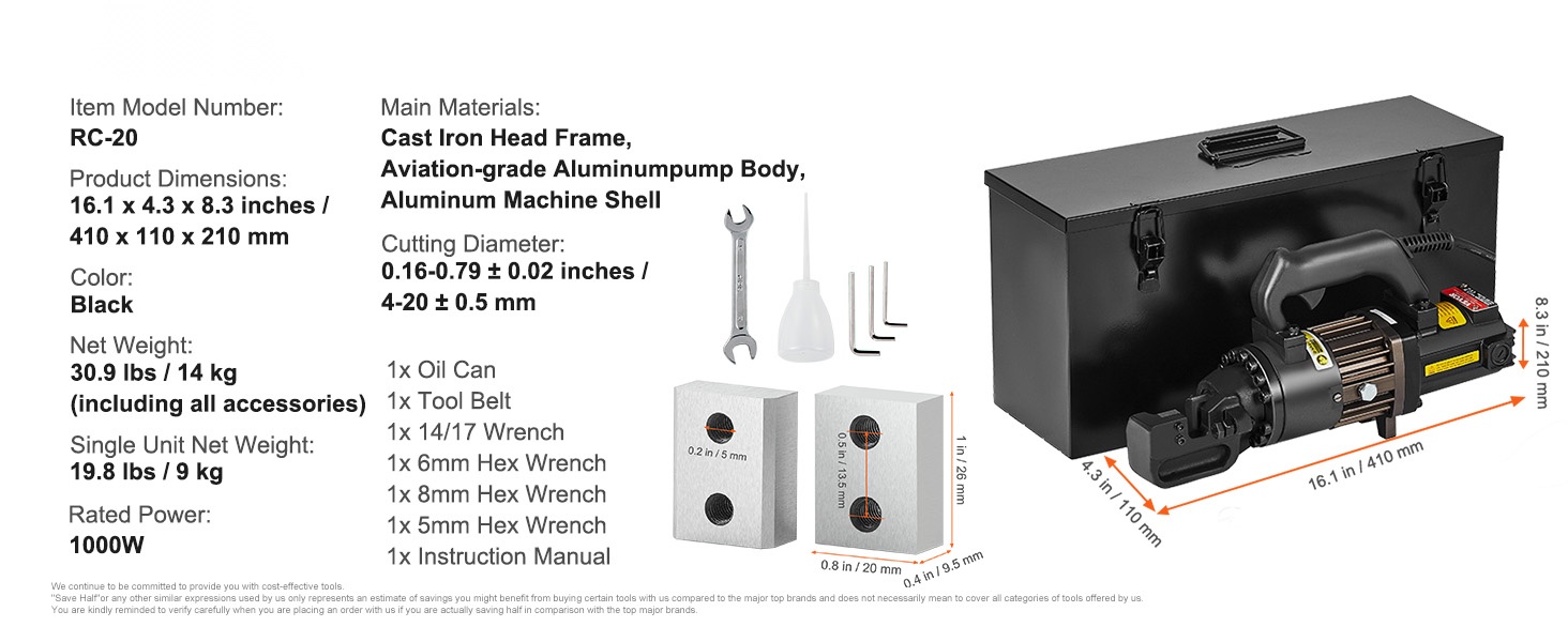 Hydraulinen sähkökäyttöinen raudoitusleikkuri 1000W 4–20 mm RC-20