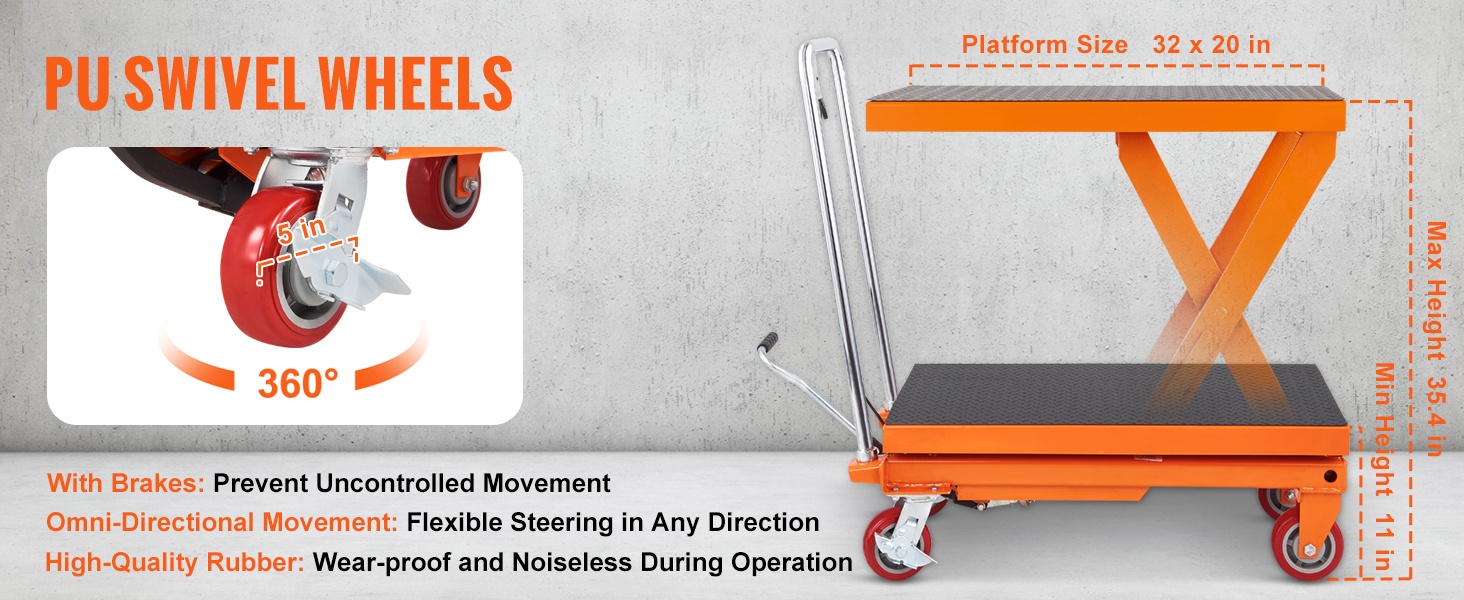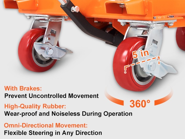 Hydraulisessa saksikärryssä on suorituskykyiset kääntöpyörät, jotka kääntyvät useaan suuntaan ja joissa on luotettava lukitusmekanismi. Kulutusta ja korroosiota kestävät pyörät tekevät raskaidenkin esineiden siirtämisestä sujuvaa ja hallittua.