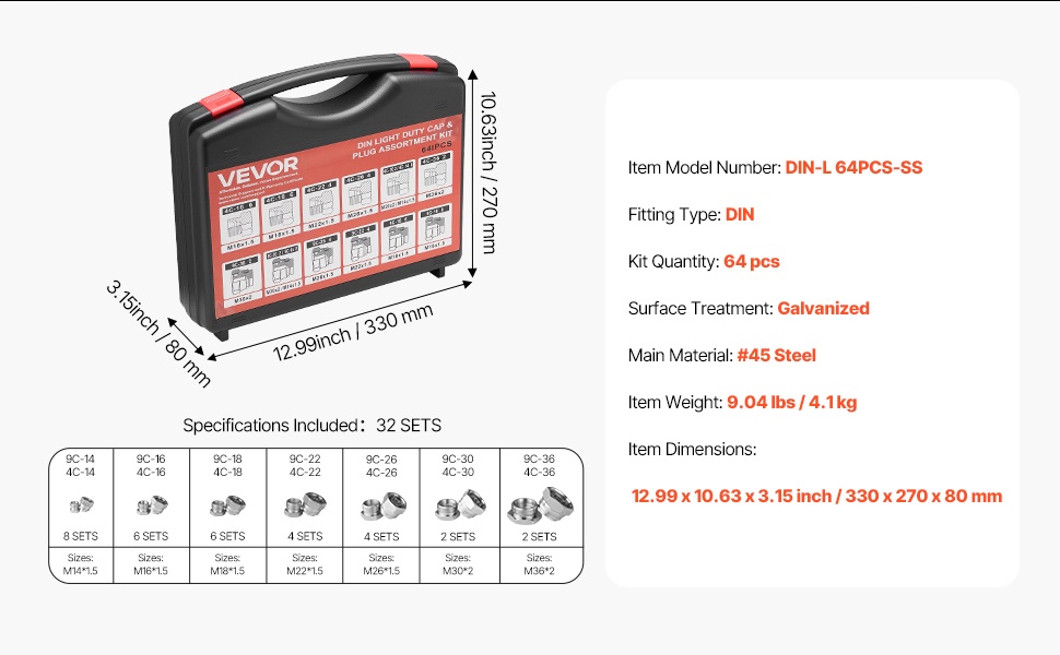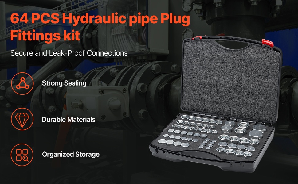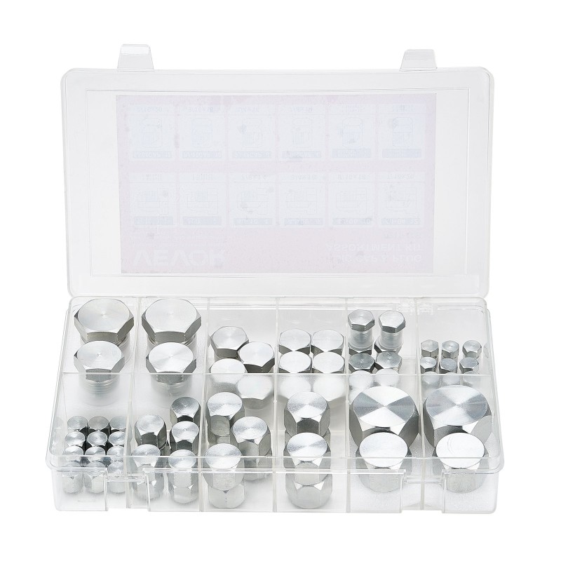72-osainen hydraulisten putkien tulppa- ja suojamuhvisarja tarjoaa laajan kokovalikoiman, tarkat kierteet ja tiiviit liitokset vuotojen estämiseksi. Osat on valmistettu sinkitystä #45-teräksestä, joka kestää korroosiota ja mekaanista rasitusta. Järjestelmällinen, lokeroitu säilytyslaatikko helpottaa osien löytämistä ja kuljettamista. Soveltuu teollisuuden, maatalouden ja maanrakennuskoneiden hydraulijärjestelmiin.