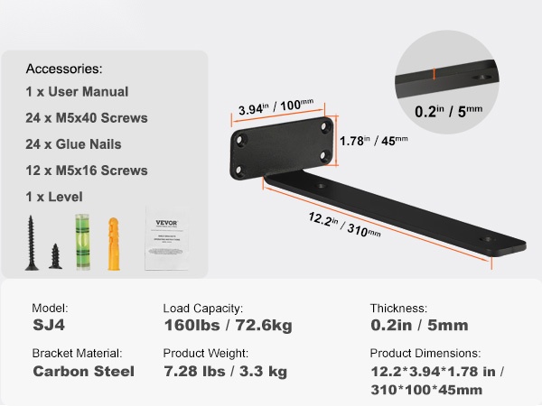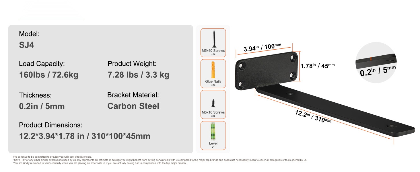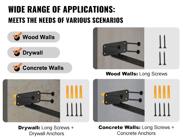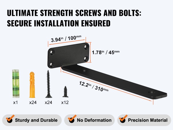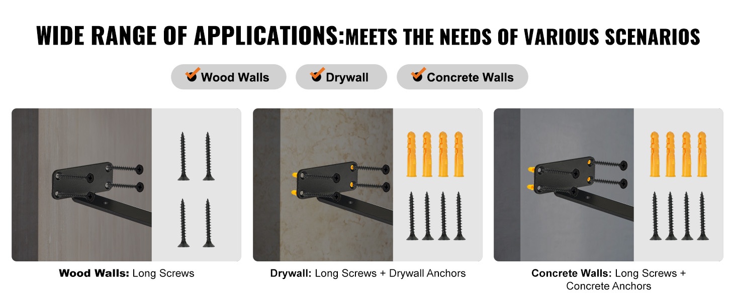 Pakkaukseen sisältyy erilaisia ruuveja ja pultteja, jotta kannattimet voidaan kiinnittää eri tyyppisiin seiniin. Oikein valituilla kiinnikkeillä hyllyt pysyvät tukevasti paikoillaan myös vaihtelevilla seinämateriaaleilla.