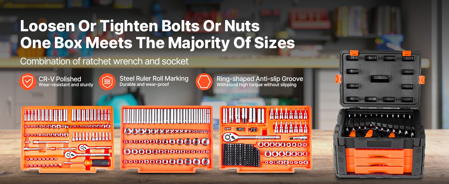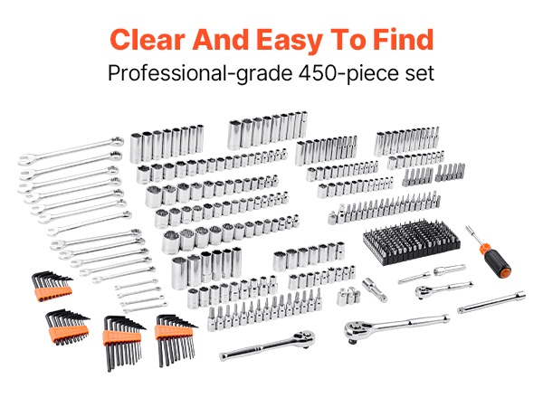 Tämä 450-osainen hylsy- ja työkalusarja on merkitty selkeästi, jotta hylsykokojen tunnistaminen on nopeaa. Se soveltuu sekä kotihuoltoihin että ammattikäyttöön, ja auttaa työskentelemään tehokkaammin ja järjestelmällisemmin.