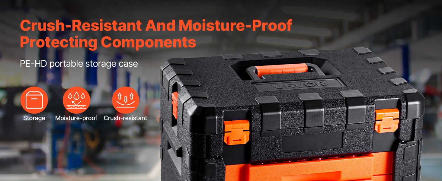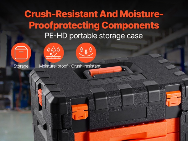 Kaikki osat on pakattu kompaktiin, kannettavaan HD-PE-säilytyslaatikkoon, jossa on oranssi laatikko ja omat paikat jokaiselle työkalulle. Näin työkalut pysyvät järjestyksessä ja helposti löydettävissä.