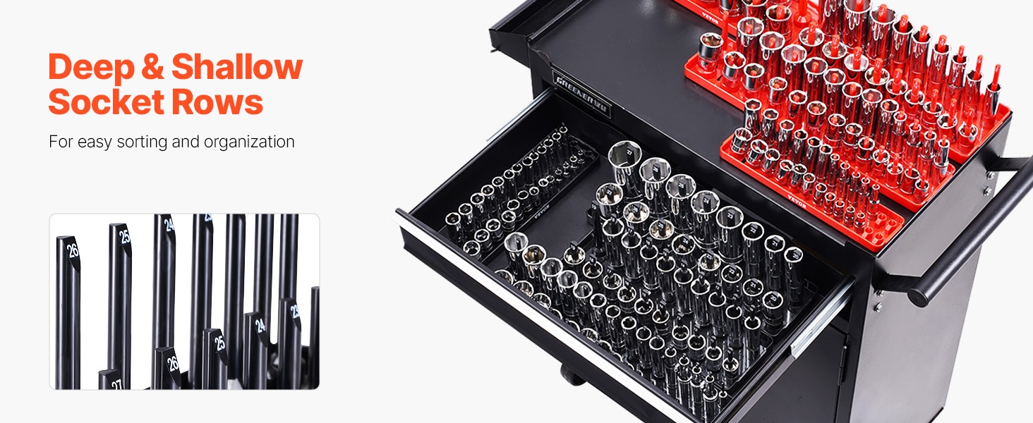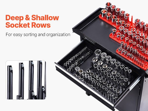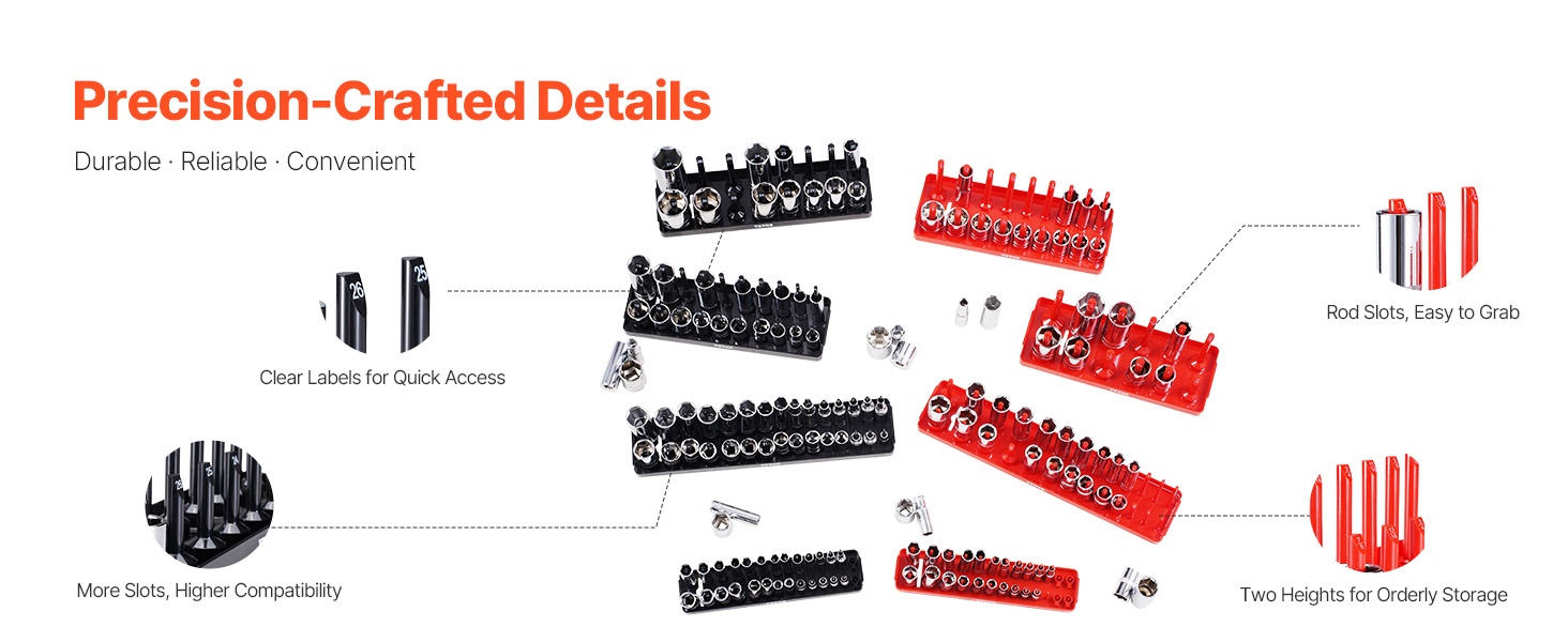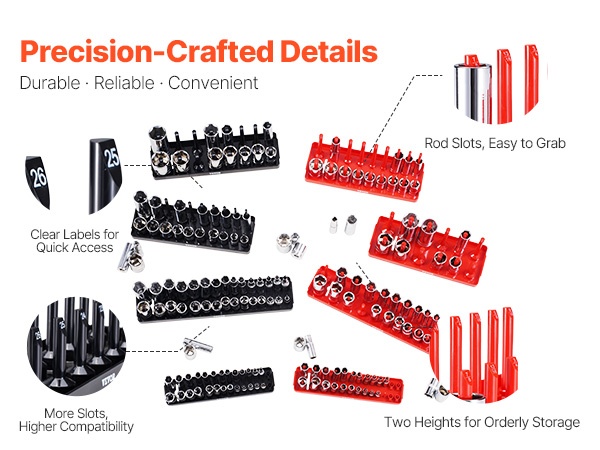 Korkea hylsyjen järjestelijäsarja tarjoaa paikan jopa 176 hylsylle ja on yhteensopiva monien eri merkkien kanssa. Syvien ja matalien hylsyjen omat rivit tekevät säilytyksestä selkeää ja pitävät työkalut hyvässä järjestyksessä.