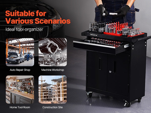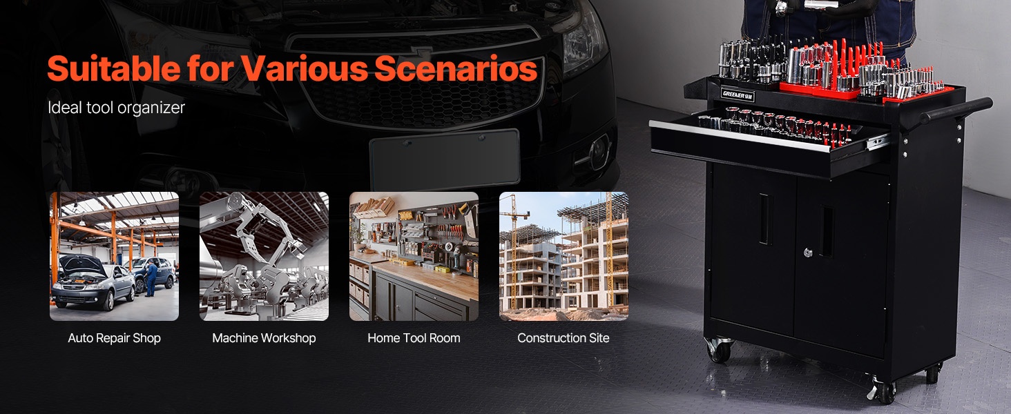 Korkea hylsyjen järjestelijä sopii hyvin esimerkiksi autokorjaamoihin, tuotantolaitoksiin ja muuhun kunnossapitotyöhön, missä selkeä työkalujen järjestys tukee tehokasta työskentelyä.