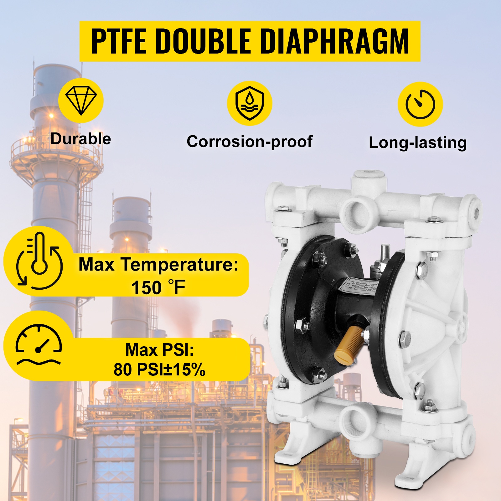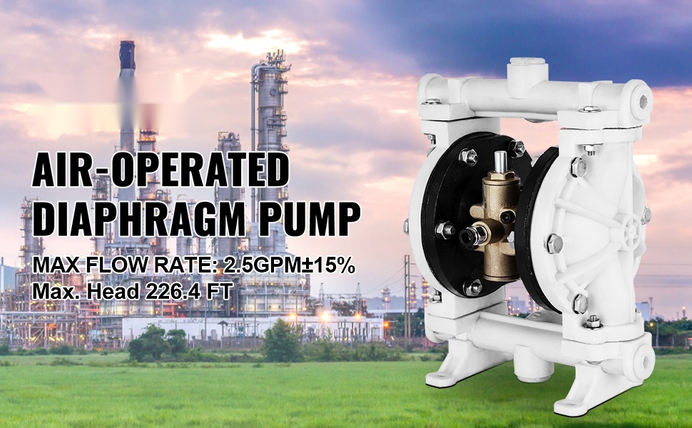 Itsetäyttävä pumppu on varustettu kahdella PTFE-kalvolla, joilla on hyvä kemiallinen kestävyys ja ikääntymisen sietokyky. Suurin virtausnopeus: 3 GPM; suurin nostokorkeus: 196.85 jalkaa / 60 m ±15 %.