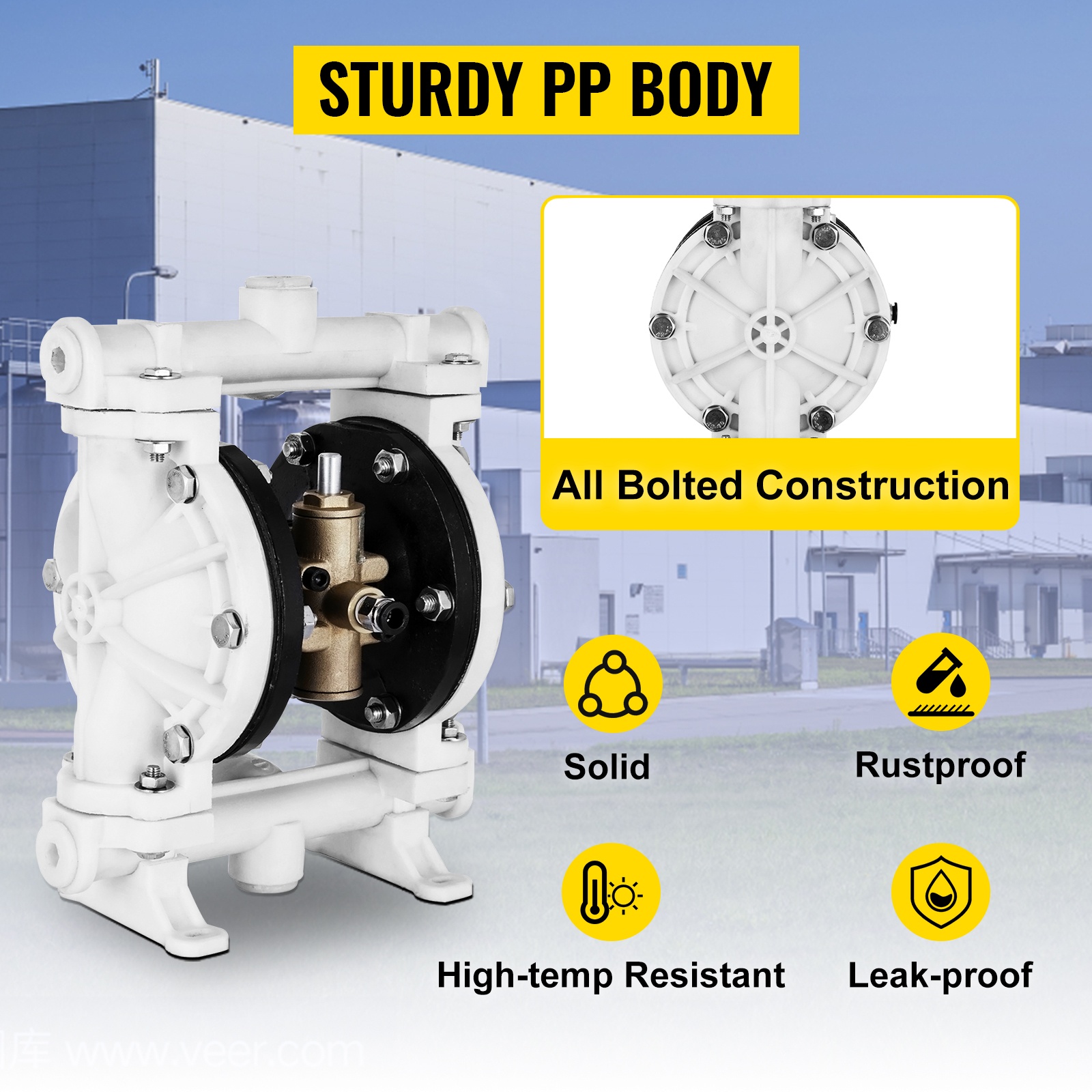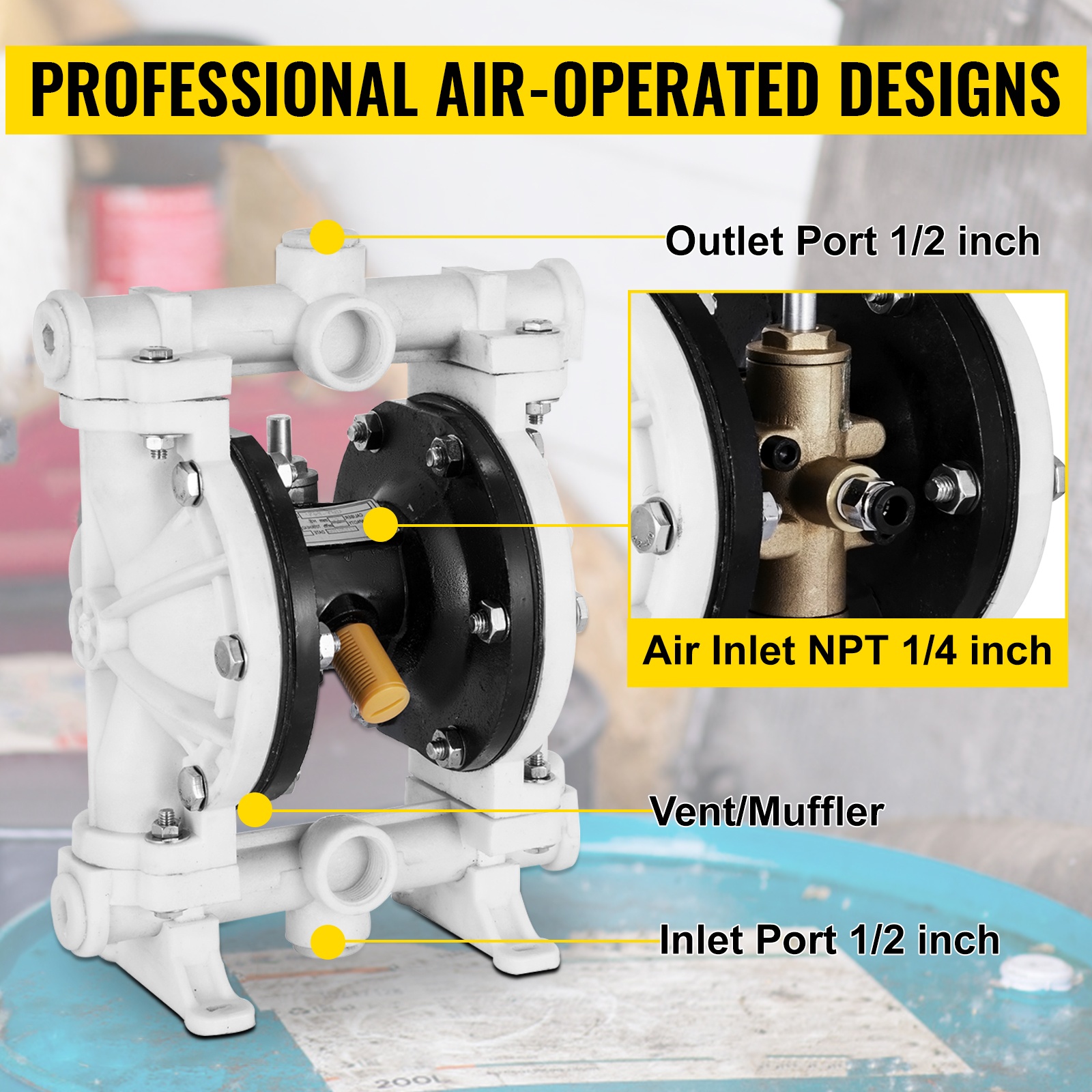 Pumppu on suunniteltu tarjoamaan luotettavaa toimintaa teollisissa kohteissa. Imu- ja poistoliittimen koko: 1/2 tuumaa; ilman sisääntulon koko: FNPT 1/4 tuumaa.
