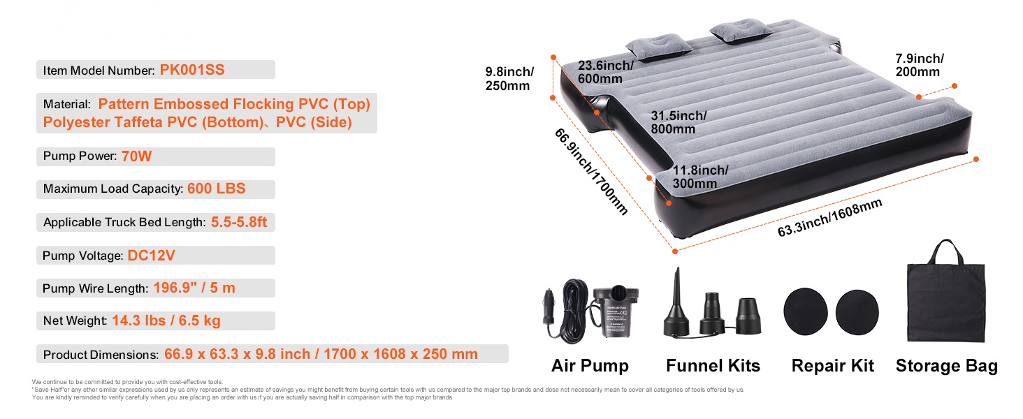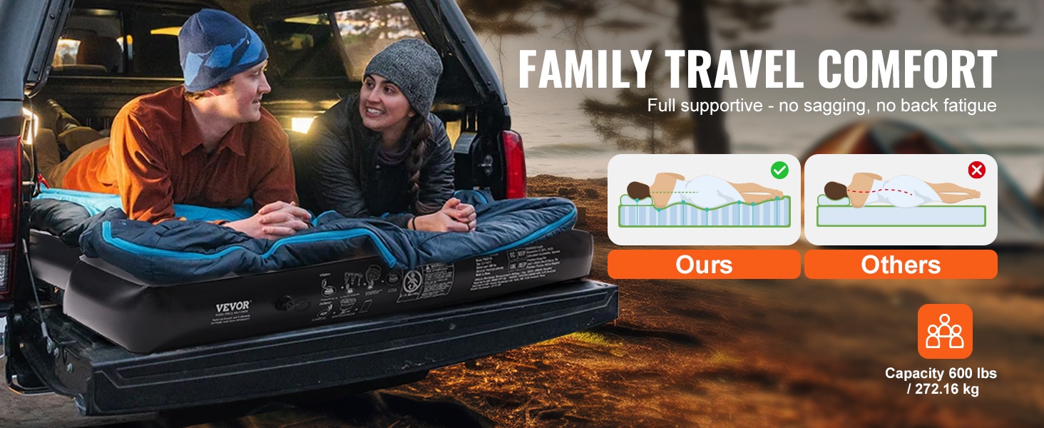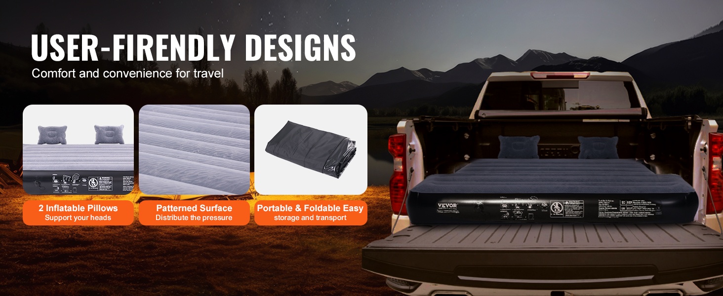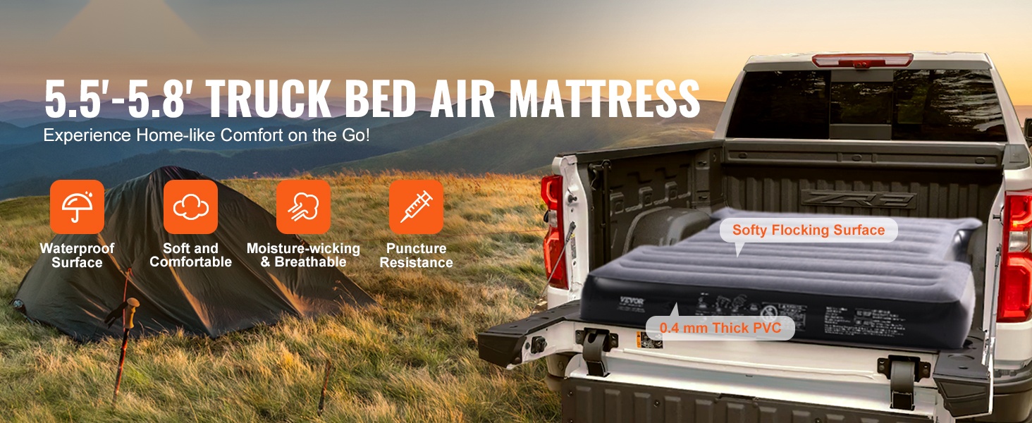Tämä 6–6.5 ft lavallisiin täysikokoisiin lava-autoihin suunniteltu ilmapatja tekee autosi lavasta mukavan nukkumapaikan. Vedenpitävä ja miellyttävän tuntuinen pinta sekä hyvä pistonkestävyys lisäävät käyttömukavuutta ja pidentävät käyttöikää, jotta ulkoilu- ja camping-retket sujuvat rennosti koko perheelle.