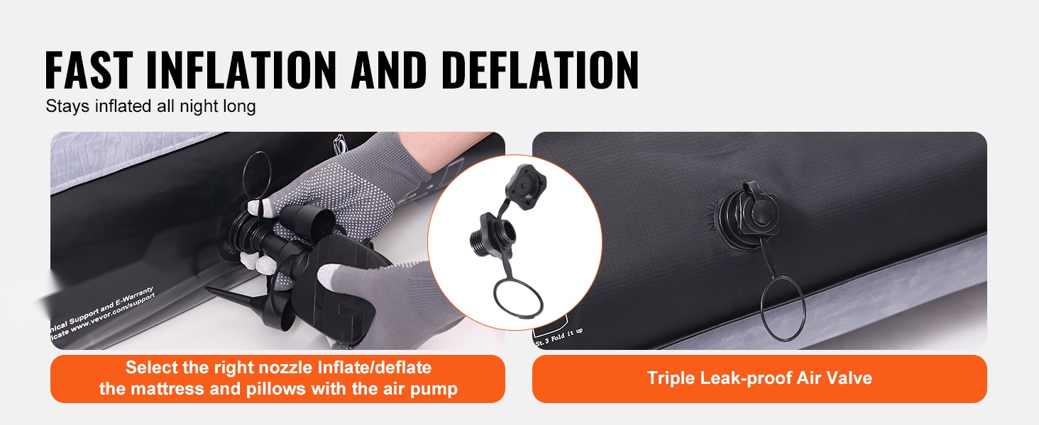 Mukana tuleva DC12V ilmapumppu mahdollistaa patjan nopean täytön ja tyhjennyksen. Kolmoistiivistetty ilmapohjaventtiili vähentää ilmavuotoja ja varmistaa tiiviin sulun, jolloin patja pysyy käyttömukavana pidempään ja käyttöönotto sujuu nopeasti.