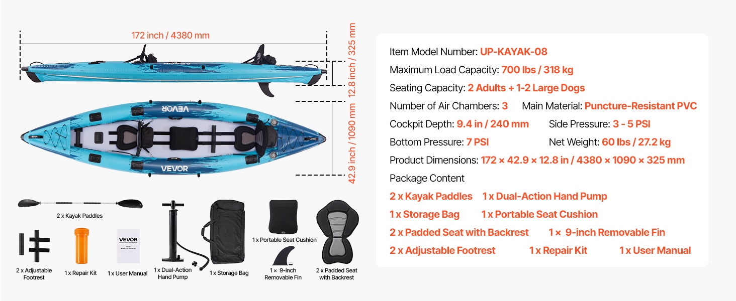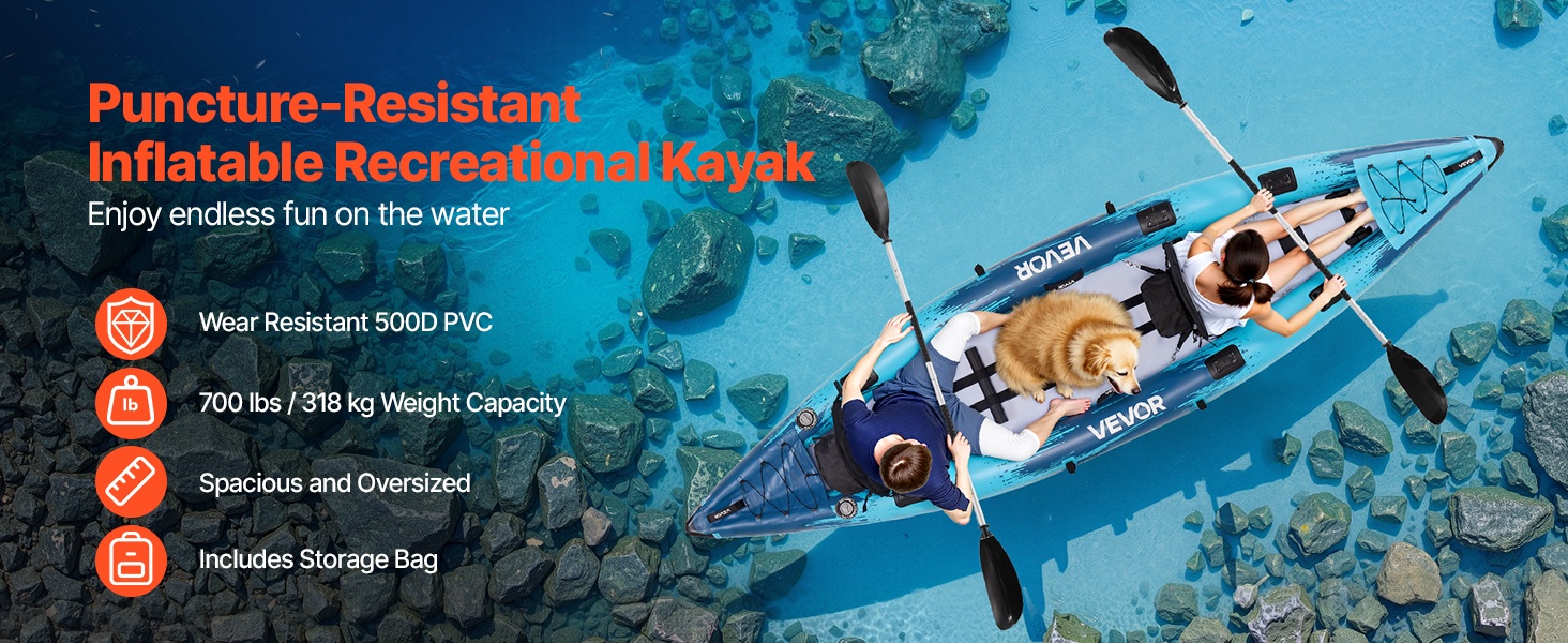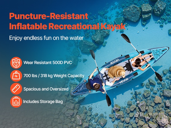 Tämä ilmatäytteinen kajakki yhdistää vahvan kantokyvyn, tarkan ohjattavuuden, jäykän rakenteen, mukavan istuinratkaisun ja helpon täytön. Kulutusta ja puhkaisuja kestävä runko kantaa jopa 700 paunaa / 318 kg, joten se sopii hyvin 2 aikuiselle ja 1–2 suurelle koiralle. Lopputuloksena on tasainen ja miellyttävä melontakokemus.
