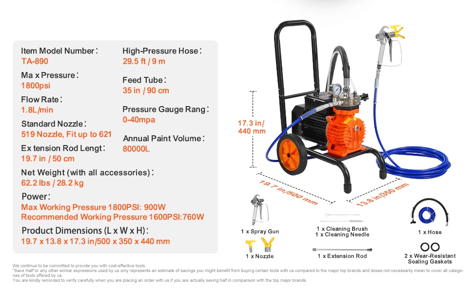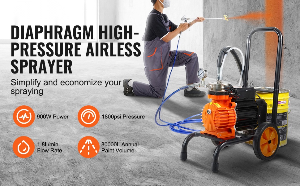 Kärryllä varustettu ilmaton maalausruisku tuottaa jopa 1800psi paineen ja 1.8L/min virtausnopeuden. Vuotuinen enimmäismaalimäärä on 80000L, joten laite sopii hyvin usein toistuviin ja laajoihin maalausurakoihin vaativissa ympäristöissä.