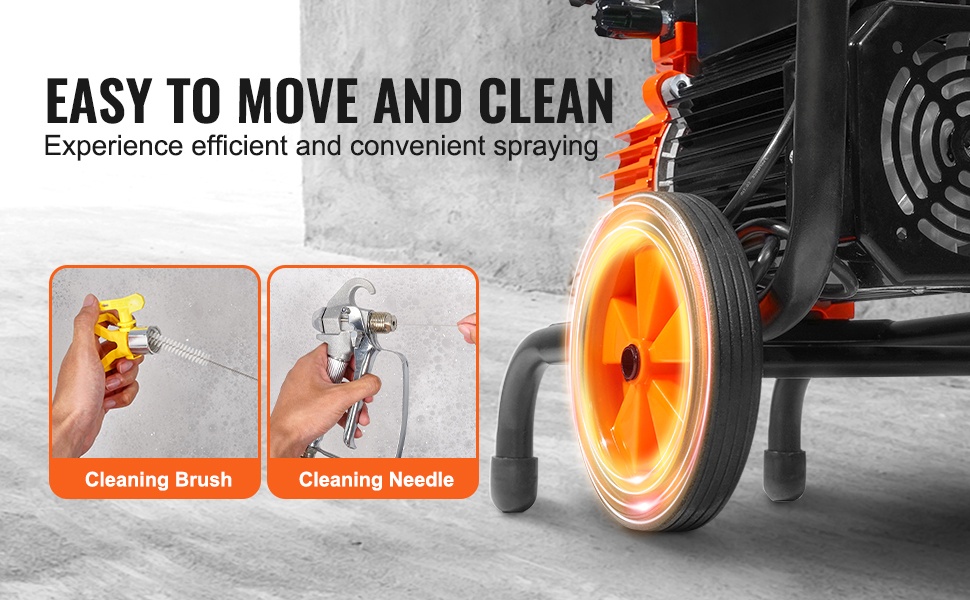 Pyörillä varustettu rakenne mahdollistaa sähköisen ilmettömän maalausruiskun siirtämisen haluttuun paikkaan ilman nostamista. Tämä helpottaa työskentelyä erityisesti suurilla tai usein vaihtuvilla työalueilla. Mukana toimitettu puhdistusneula ja -harja yksinkertaistavat laitteen puhdistusta ja ylläpitoa.