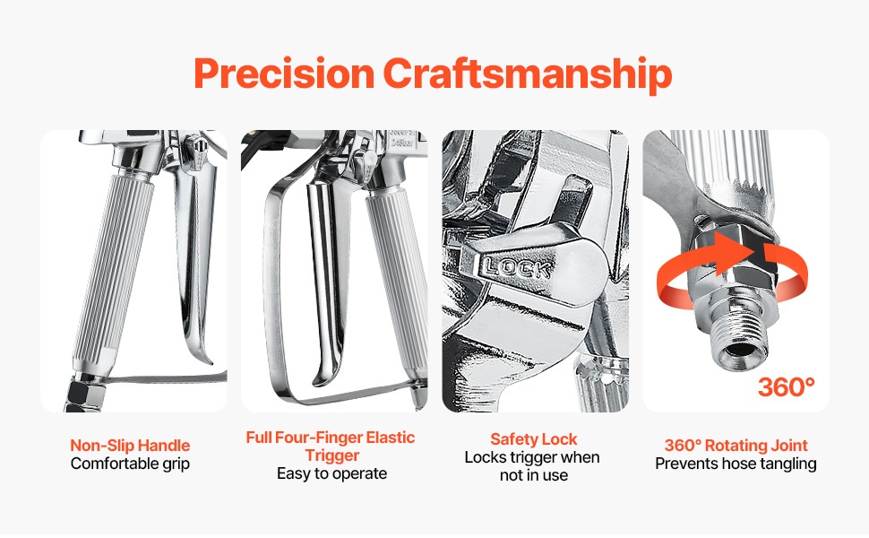 Jokainen yksityiskohta on suunniteltu helpottamaan käyttöä ja parantamaan turvallisuutta. Ergonominen kahva, tarkasti mitoitetut suuttimet ja helppo liitäntä tekevät ruiskusta miellyttävän käyttää niin satunnaisissa kuin toistuvissakin maalaustöissä.