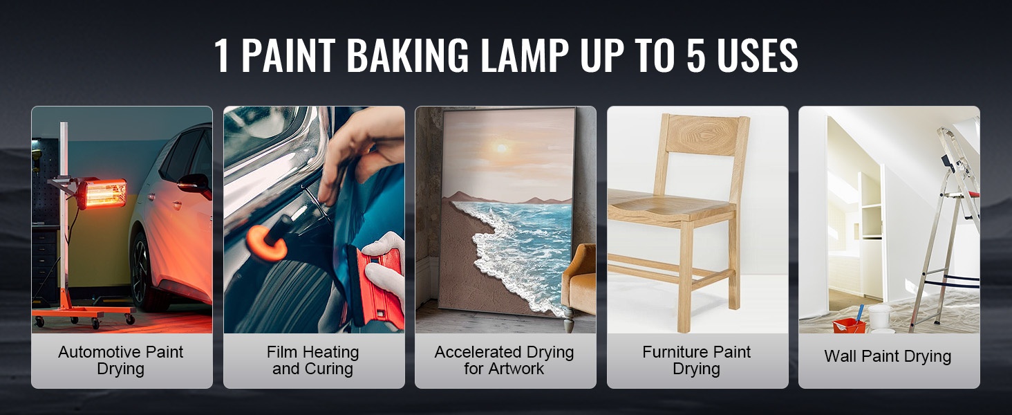 Tämä 1000W käsikäyttöinen infrapunakuivauslamppu nopeuttaa maalipintojen kovettumista ja kuivumista. Se soveltuu erityisesti paikallisiin korjauksiin, auton koripaneeleille, moottoritilaan sekä huonekalu- ja taidemaalauksille. Kompakti rakenne ja kevyt paino tekevät käytöstä vaivatonta myös pidempään yhtäjaksoisesti.