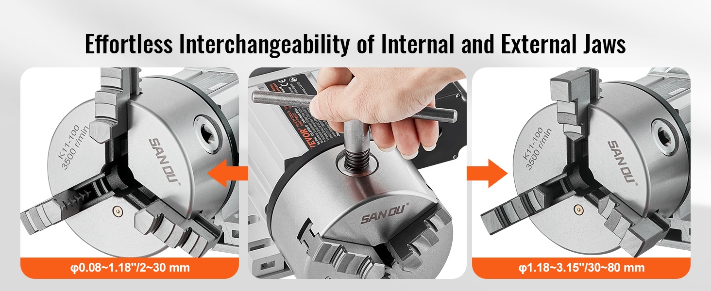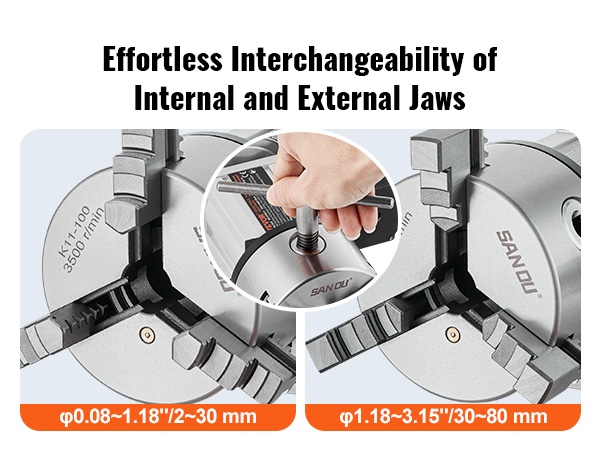 Toimitukseen sisältyy 3 sisäleukaa ja 3 ulkoleukaa. Leukojen vaihtaminen käy nopeasti mukana tulevalla T-avaimella, ja pakka tarjoaa pitävän otteen tarkkaan työstöön. Näin asetusten vaihto onnistuu vaivattomasti eri kappaleiden välillä.