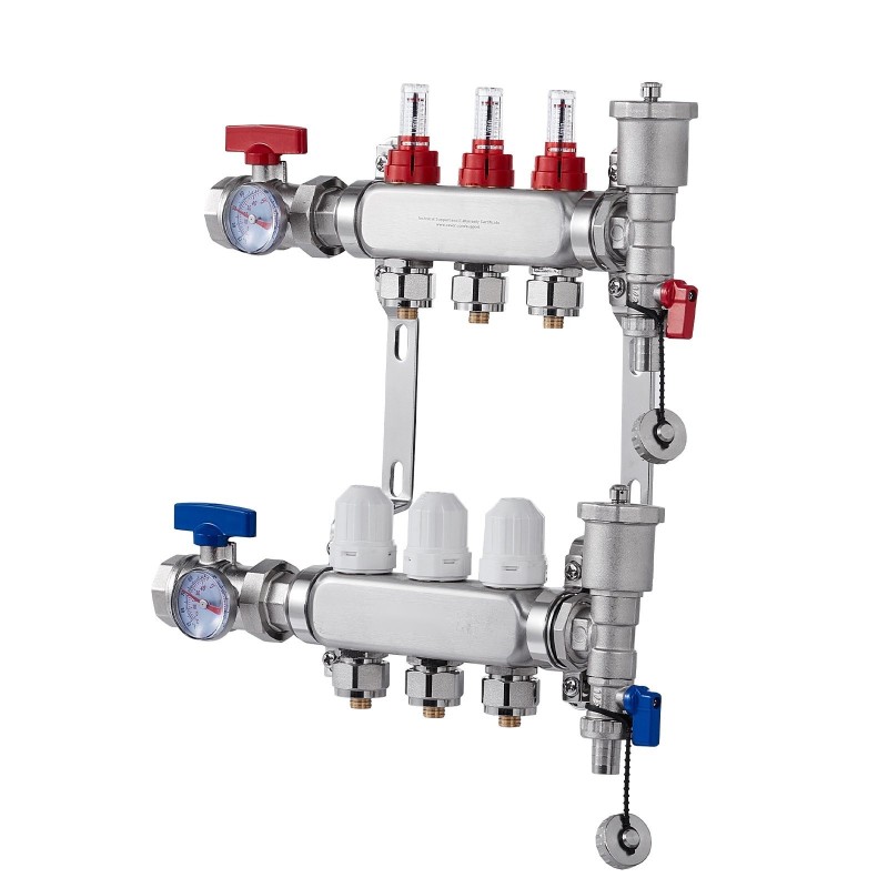 3-haarainen lattialämmityksen jakotukki 1/2" PEX-putkille jakaa lämpimän veden tasaisesti eri lämmityspiireihin. SUS304-ruostumattomasta teräksestä valmistettu rakenne kestää korkeita lämpötiloja ja korroosiota, mikä takaa pitkän käyttöiän ja luotettavan toiminnan.