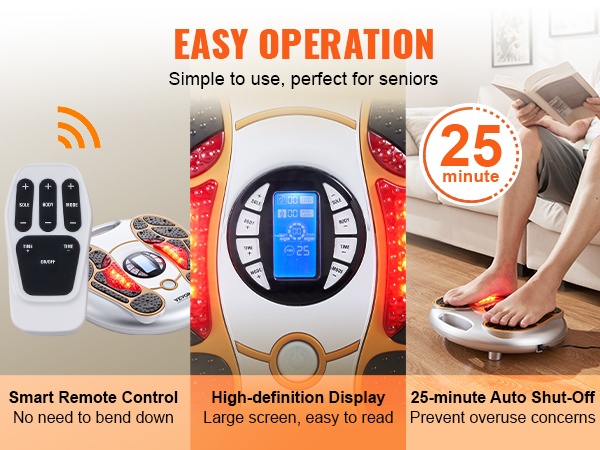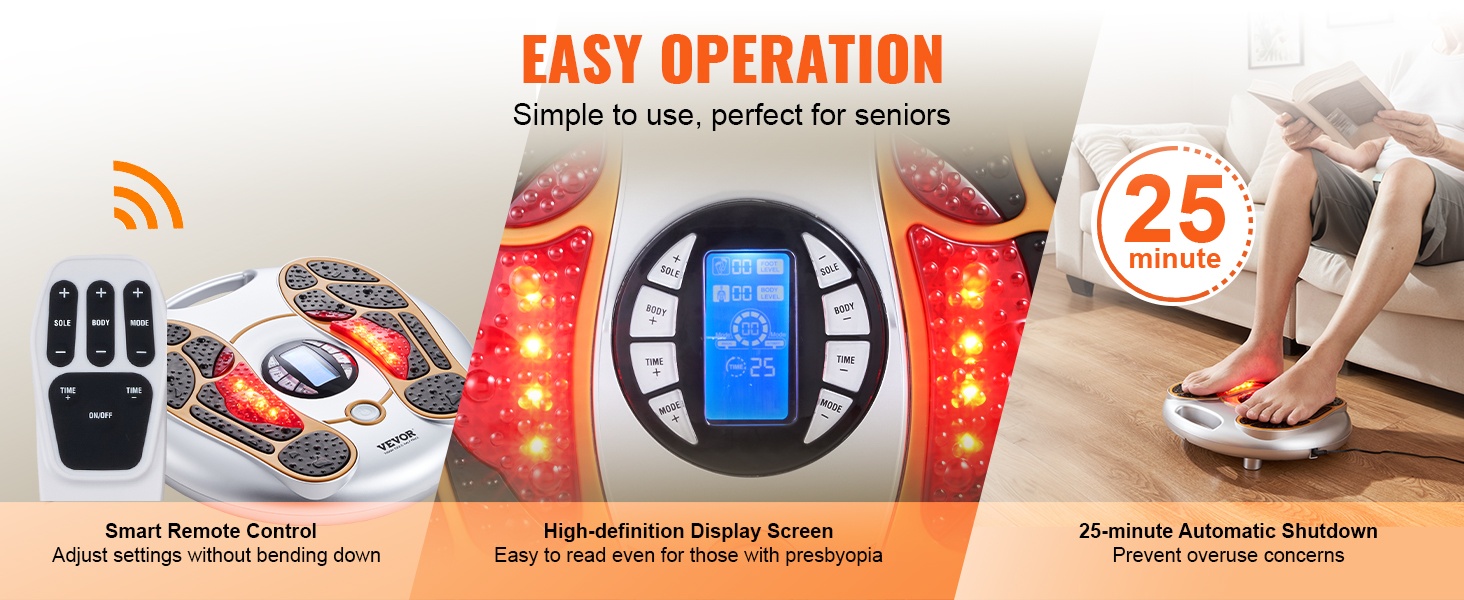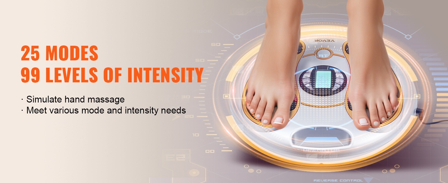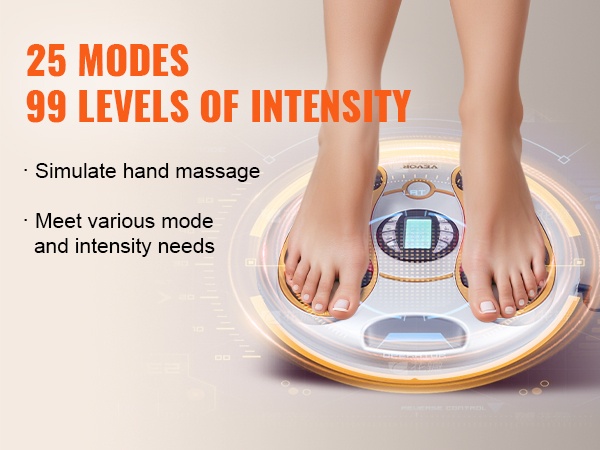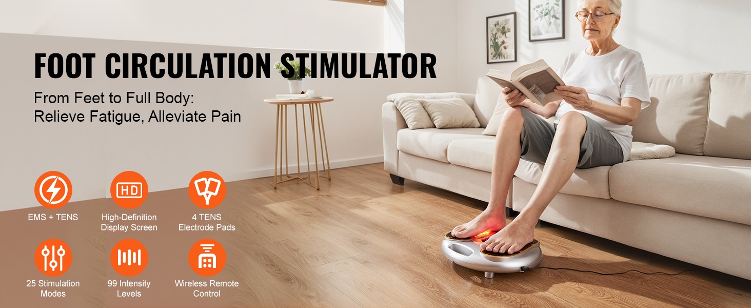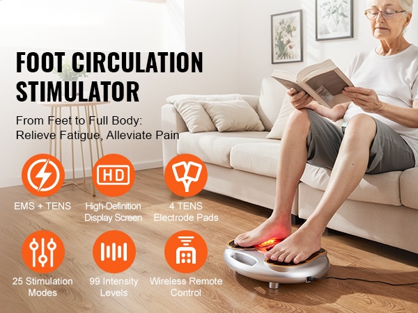 Jalkojen verenkiertoa stimuloiva laite yhdistää EMS- ja TENS-teknologian sekä mekaanisen hierontarullan. Se stimuloi jalkojen hermoja, rentouttaa lihaksia ja edistää verenkiertoa. 25 hierontatilaa ja 99 säädettävää voimakkuustasoa auttavat löytämään miellyttävän asetuksen kotihoitoa varten.