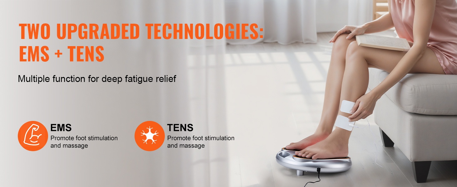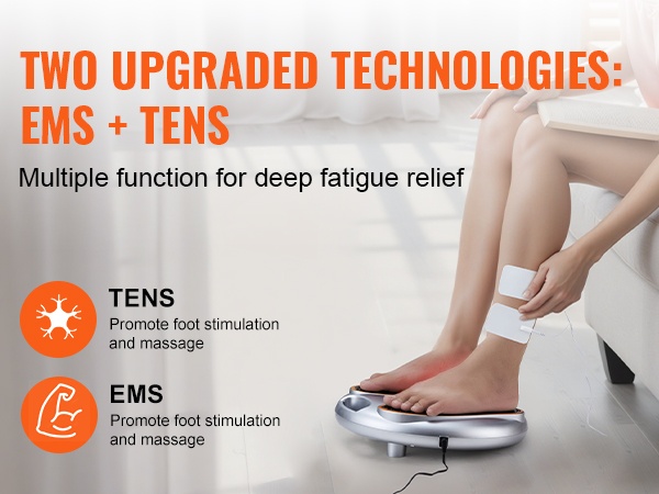- EMS- ja TENS-teknologia jalkojen ja kehon lihasten sekä hermojen stimulointiin