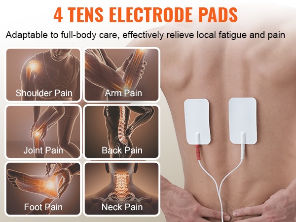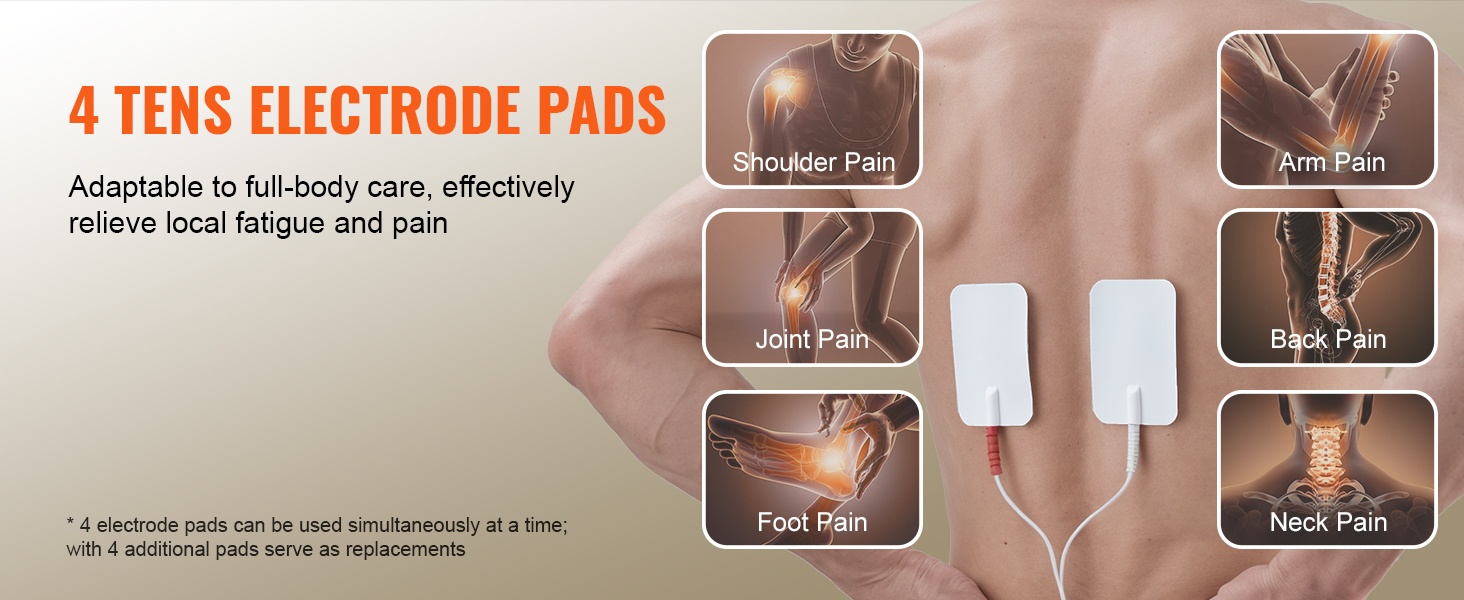 Mukana tulee 4 + 4 TENS-elektrodityynyä koko kehon käyttöön. Niillä voidaan kohdistaa hoitoa esimerkiksi hartioihin, käsivarsiin, selkään, jalkoihin tai niskaan. Voit käyttää samanaikaisesti jopa 4 elektrodityynyä, ja toiset 4 tyynyä toimivat varatyynyinä.