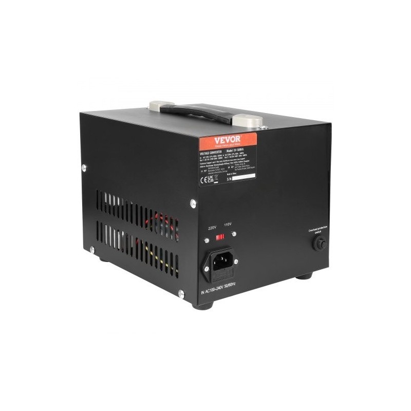 500VA askel ylös / askel alas -jännitemuuntaja mahdollistaa kaksisuuntaisen muunnoksen välillä 110V ja 220V. Sen avulla voit käyttää kodin laitteita ulkomailla ja tuoda ulkomailta hankittuja laitteita toimimaan kotona, kunhan käytössä on kohdemaan standardiin sopiva virtajohto.