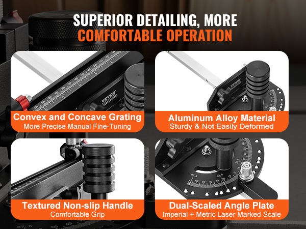 Jiiriohjain on valmistettu alumiiniseoksesta, joka kestää käyttöä ja vähentää muodonmuutoksia. Kupera–kovera ohjainkisko ja hienosäätöruuvit mahdollistavat pienen manuaalisen mikrosäädön. Kulmalevyn asteikko on laserkaiverrettu, ja kuvioitu metallikahva parantaa otetta ja käyttömukavuutta.