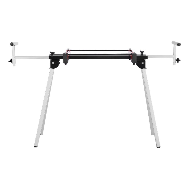 Jalustan tukivarsien pituutta voi säätää työkappaleen koon mukaan, jotta myös pitkät ja painavat materiaalit pysyvät tukevasti. Korkeutta voidaan muuttaa erikseen molemmilta puolilta, mikä helpottaa kulmaleikkausten tekemistä tarkasti.