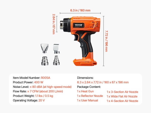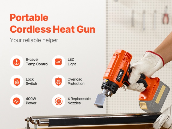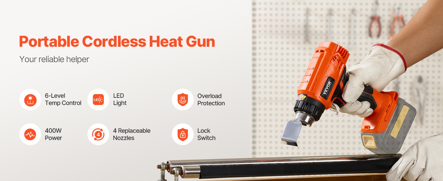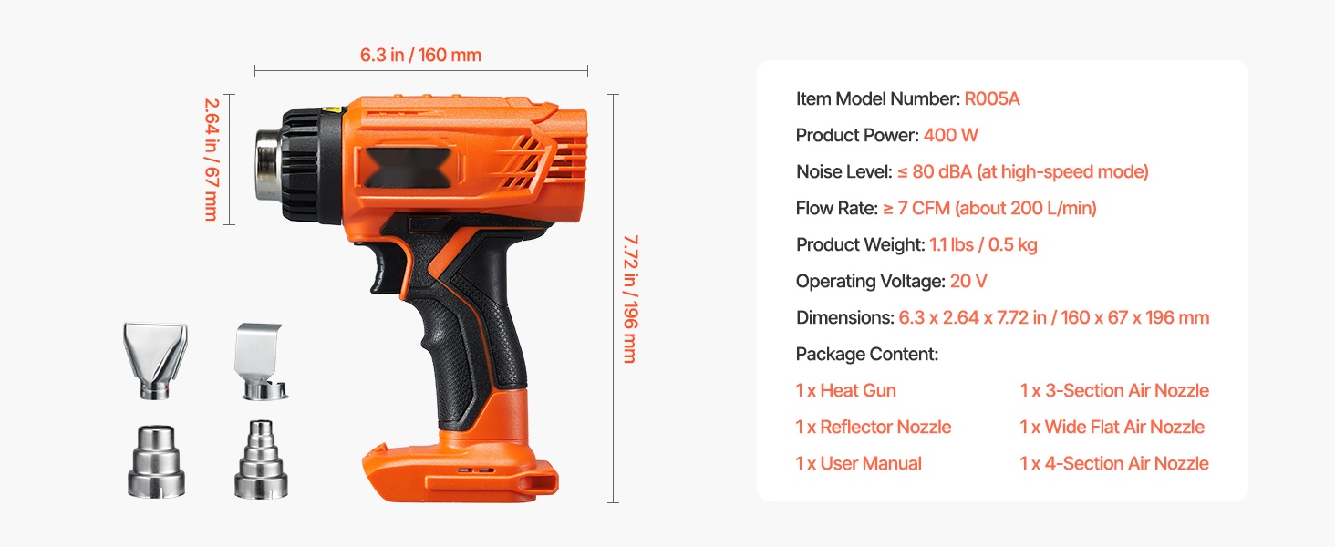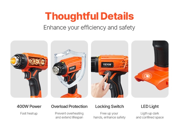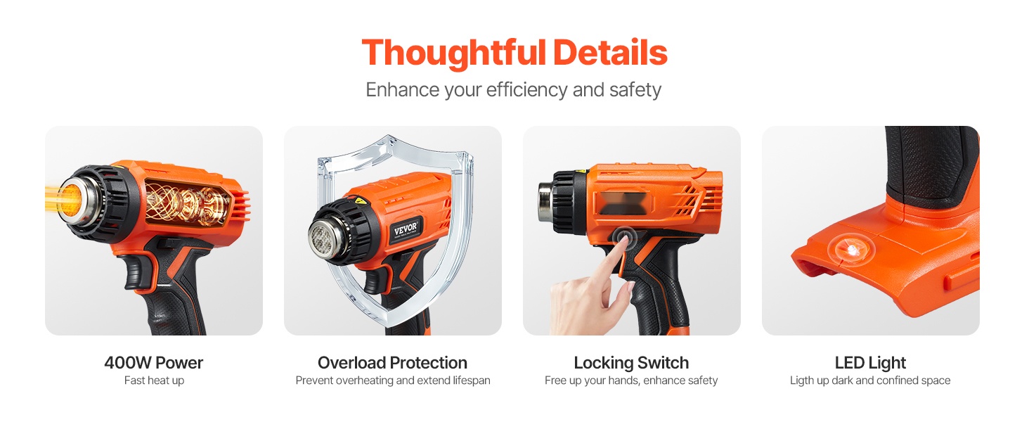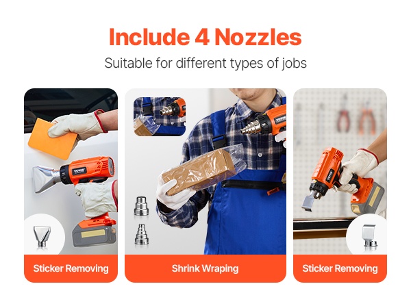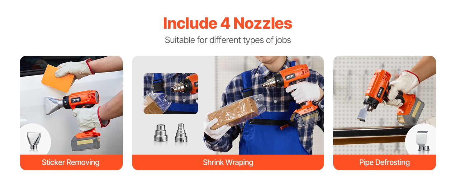 Pakkaukseen kuuluu 4 suutinta, joilla voit mukauttaa ilmavirran eri tehtäviin, kuten kutistemuovien käsittelyyn, kalvotuksiin, PVC-kääreisiin ja maalin poistoon. Monikäyttöisyytensä ansiosta laite soveltuu monenlaisiin korjaus-, viimeistely- ja askarteluprojekteihin.