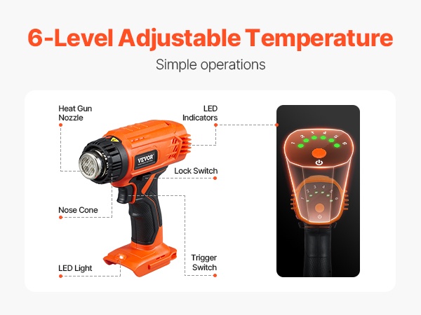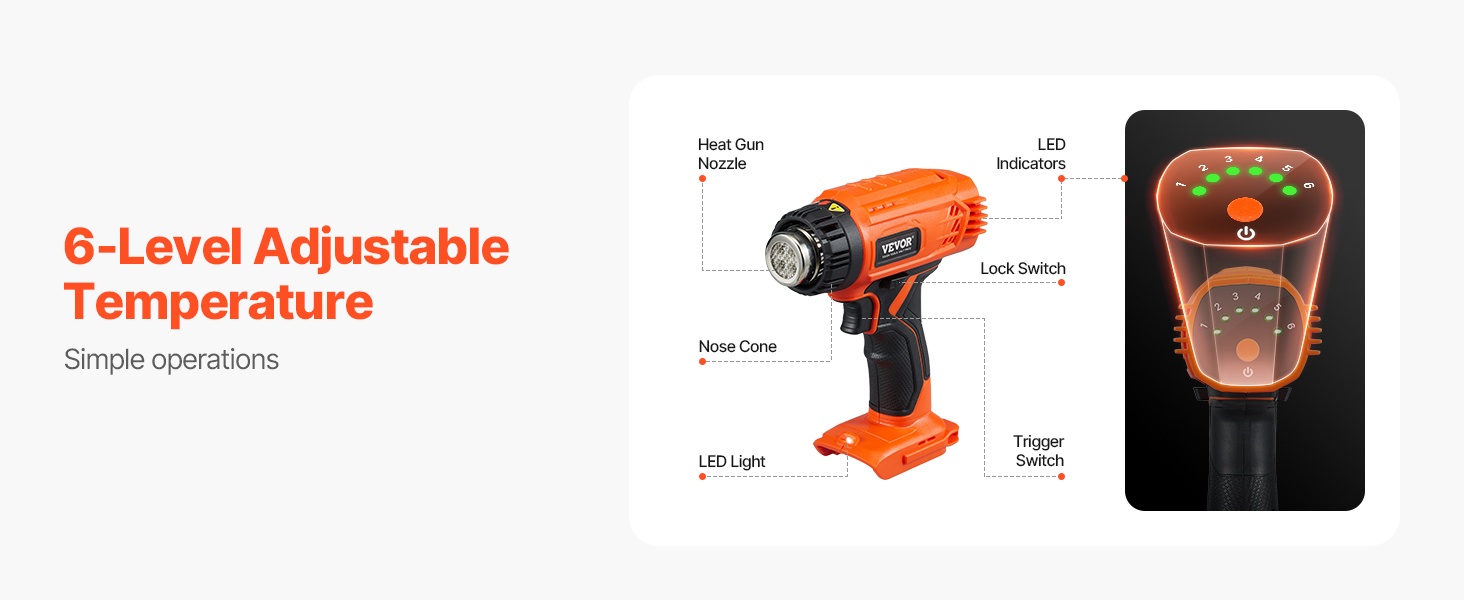 Vahva moottori tuottaa lämpöä nopeasti, mikä nopeuttaa työskentelyä. Sisäänrakennettu alijännitesuoja ehkäisee ylikuumenemista ja suojaa laitetta. Lukituskytkin vapauttaa kädet pitkäkestoiseen lämmitykseen, ja LED-valo parantaa näkyvyyttä pimeissä ja ahtaissa paikoissa.