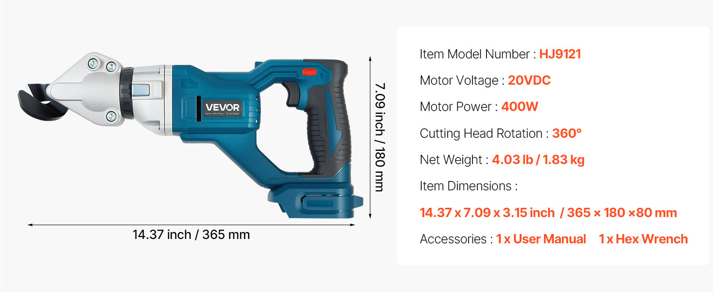 Johdoton metallileikkuri HJ9121 20 V 400 W 25000 RPM 360° kääntyvä leikkuupää