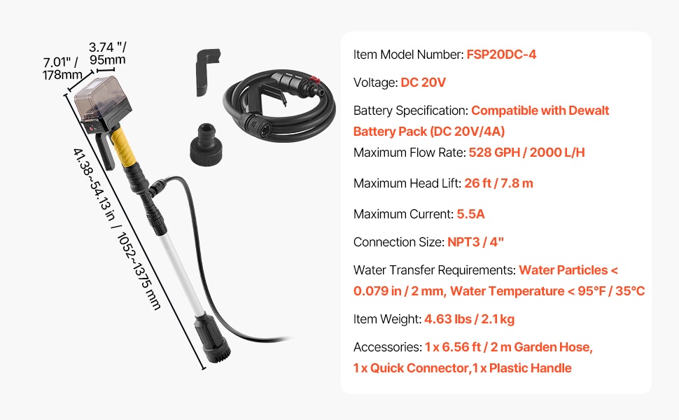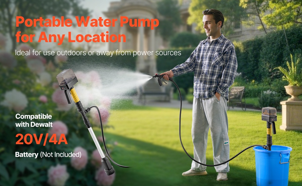 Tämä tikkumallinen vedensiirtopumppu toimii yhteensopivan Dewalt 20V/4A -akun kanssa (ilman akkua). Enimmäisvirtaus on 528 GPH / 2000 L/H ja suurin nostokorkeus 26 ft/7.8 m, joten pumppu sopii useimpiin kodin ja pihan vedensiirtotehtäviin. Harjaton 16,500 RPM -moottori, NPT3/4" puutarhaletkuliitäntä sekä 3.45–4.51 ft säädettävä korkeus auttavat käsittelemään erilaisia vedenpintoja.