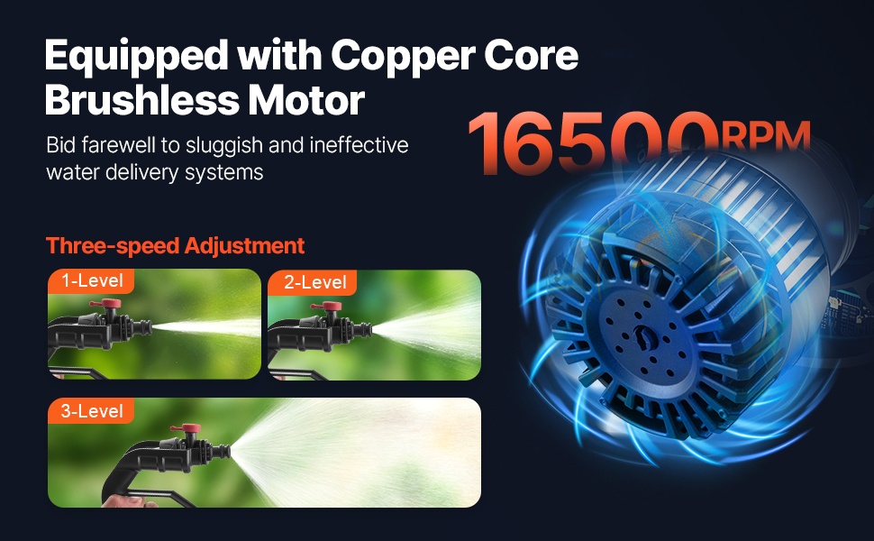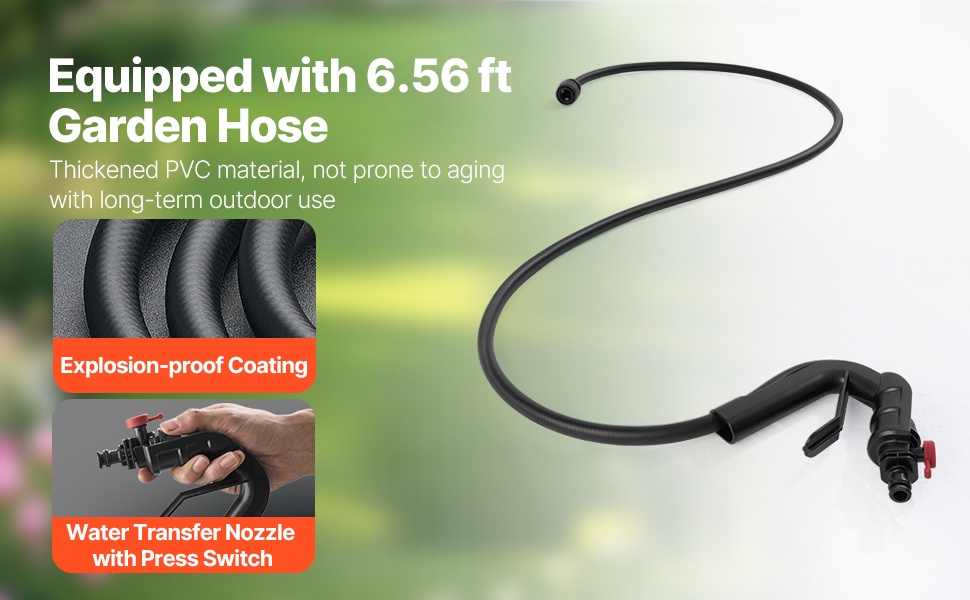 Erillistä letkun hankintaa ei tarvita – johdoton pumppu on käyttövalmis heti pakkauksesta. Mukana tuleva 6.56 ft (2 m) letku riittää useimpiin koti- ja puutarhatehtäviin. Vedensiirtosuutin on varustettu painekytkimellä, joten se sopii esimerkiksi kasvien kasteluun, ajoneuvojen pesuun ja muihin vastaaviin töihin.