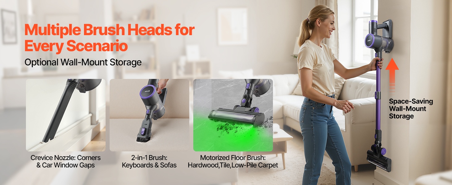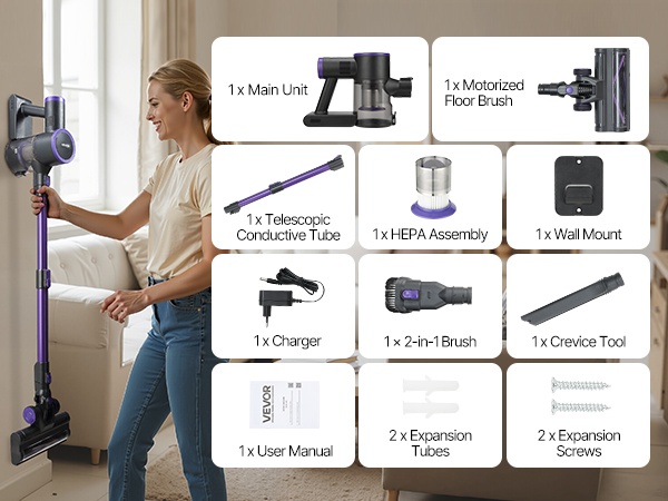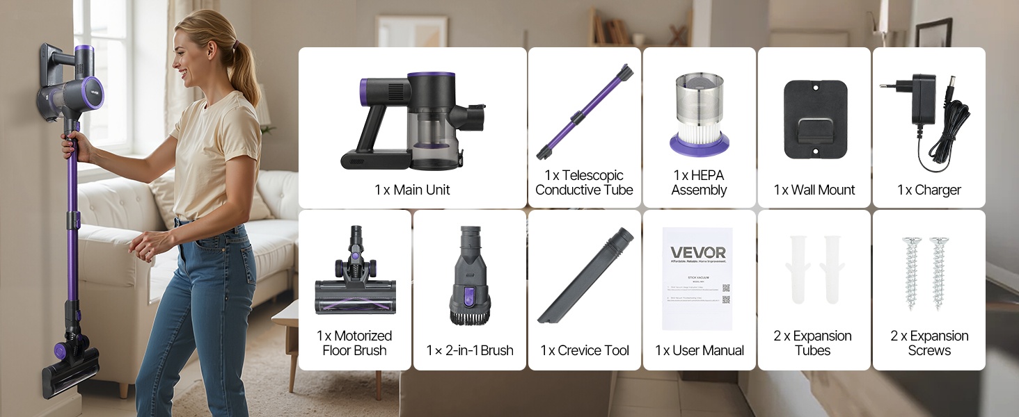 Pakkaukseen sisältyy useita vaihdettavia harja- ja rako-suulakkeita, joiden avulla puhdistat verhot, sängyt, sohvat, portaat, listojen kulmat ja muut vaikeasti tavoitettavat kohdat. Lattiasuulake soveltuu koville lattioille ja matoille, ja lemmikkitalouksissa imuri auttaa keräämään karvat eri pinnoilta.