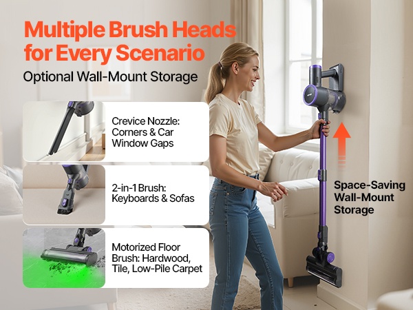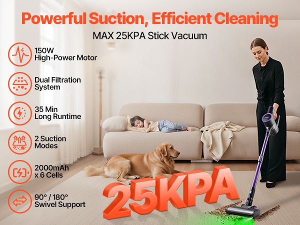 Tämä johdoton varsi-imuri yhdistää tehokkaan 250W moottorin, 3 imutehotilaa ja kaksinkertaisen suodatuksen. 7-kennoinen 2600mAh akku tarjoaa jopa 47 minuutin käyttöajan, ja 90° ylös/alas sekä 180° sivuttaiskääntyvä rakenne helpottaa siivoamista huonekalujen alta ja ahtaista kohdista ilman raskaiden kalusteiden siirtelyä.