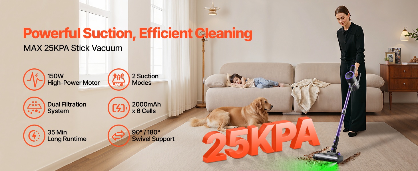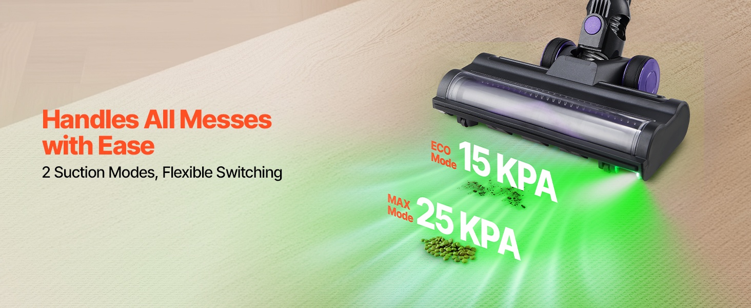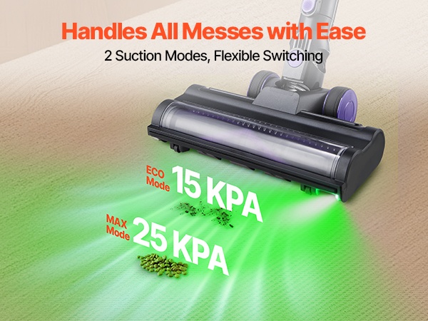 Johdoton varsi-imuri tarjoaa jopa 40KPa maksimialipaineen, jolloin se selviytyy hienosta pölystä, lemmikkieläinten karvoista ja näkyvästä liasta kovilla lattioilla ja matoilla. 3 nopeus- ja tehotilan ansiosta voit mukauttaa imutehon eri pinnoille ja likatasoille – hiljaisemmasta arkisiivouksesta voimakkaampaan pistepuhdistukseen.