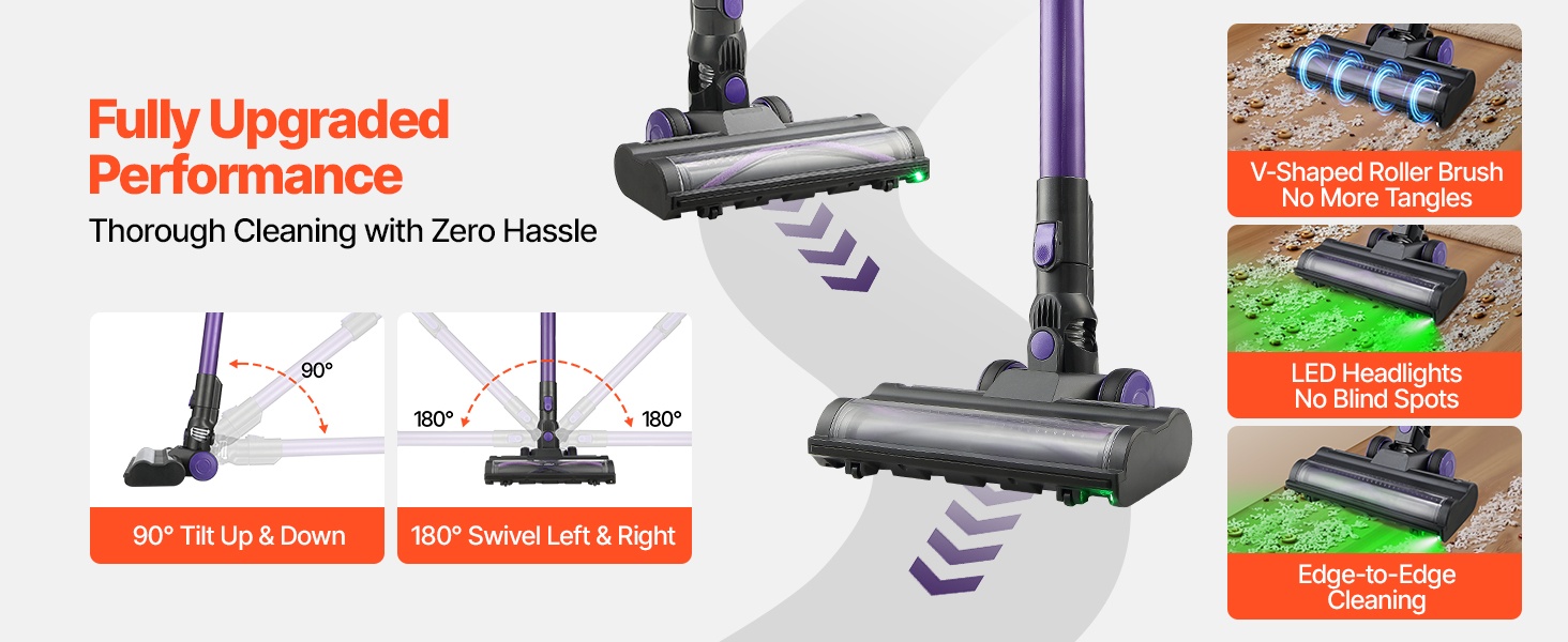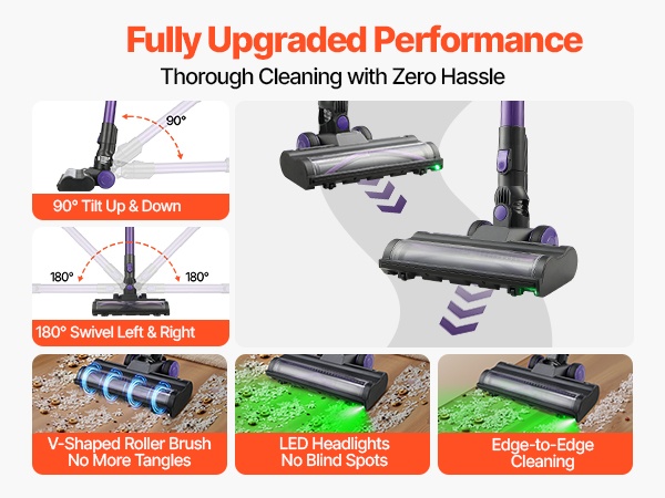 Lattiasuulake kääntyy 180° vasemmalle/oikealle ja 90° ylös/alas, joten pääset helposti kalusteiden alle, nurkkiin ja kapeisiin väleihin. LED-etuvalot valaisevat pimeät alueet, kuten sängyn ja sohvan alta, jolloin pöly ja muruset on helpompi nähdä ja poistaa.