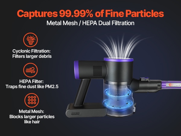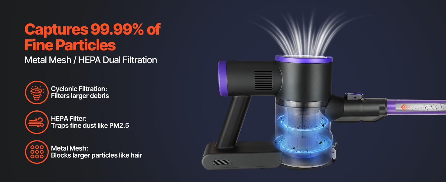 Esiasennettu ruostumattomasta teräksestä valmistettu suodatinverkko pysäyttää hiukset ja suuremmat roskat ennen HEPA-suodatinta. Tämä vähentää HEPA-suodattimen kuormitusta ja pidentää sen käyttöikää. Yhdistelmä poistaa hienojakoista pölyä ja pienhiukkasia ja auttaa pitämään sisäilman raikkaampana. Pölysäiliö tyhjennetään kätevästi yhdellä painalluksella koskematta roskiin.