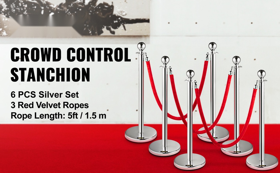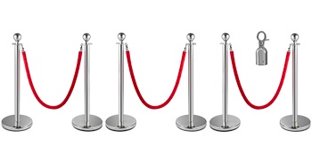 Seisontatolppasetti ruostumatonta terästä 6 tolppaa täytettävillä jaloilla 3 punaista samettiköyttä
