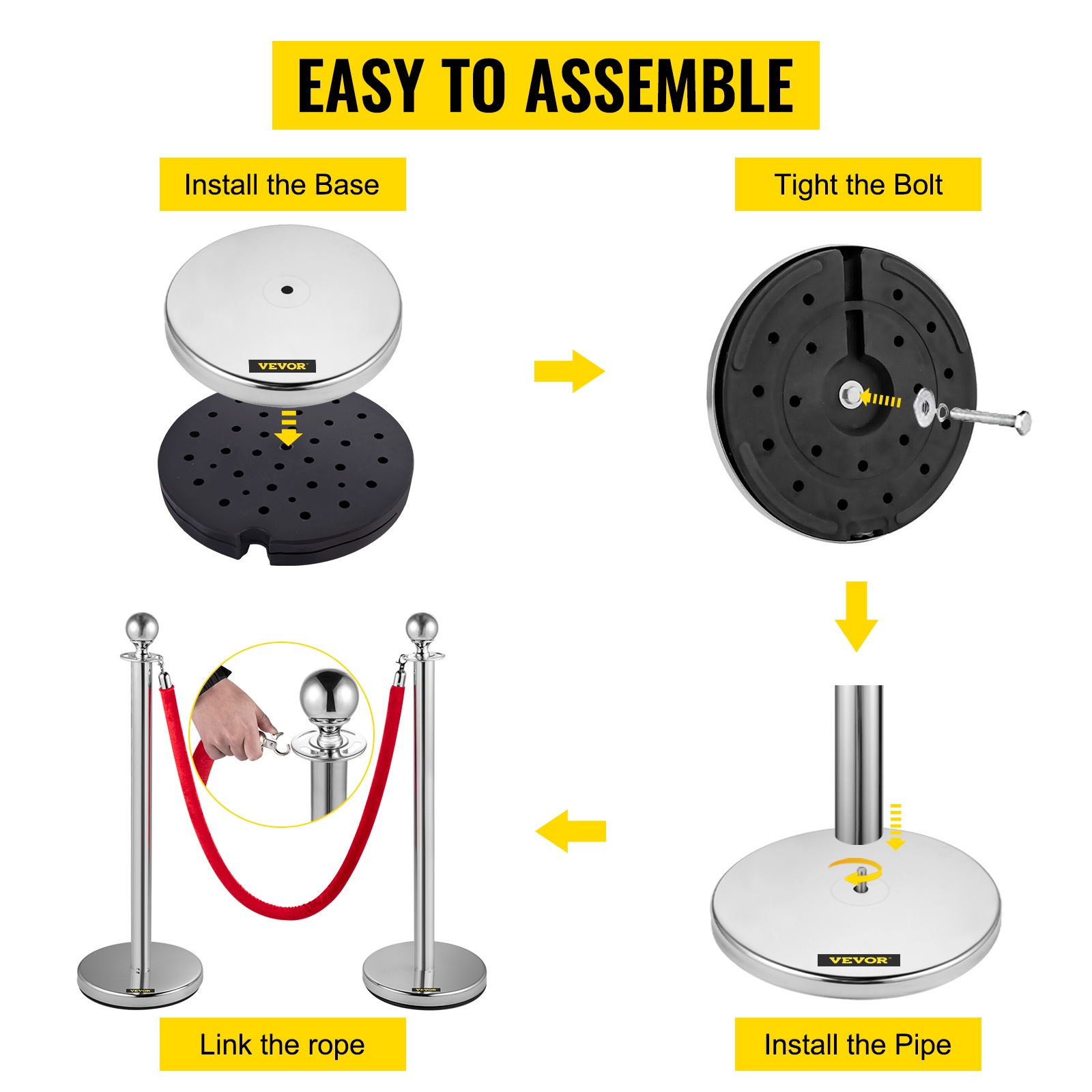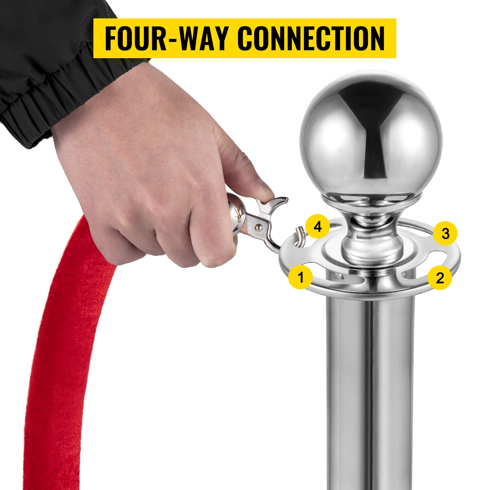 Jokaisen tolpan yläosassa on neljä liitäntäkohtaa, joihin köyden koukut lukittuvat tukevasti. Näin voit kytkeä jopa neljä köyttä samaan tolppaan ja rajata alueita joustavasti.