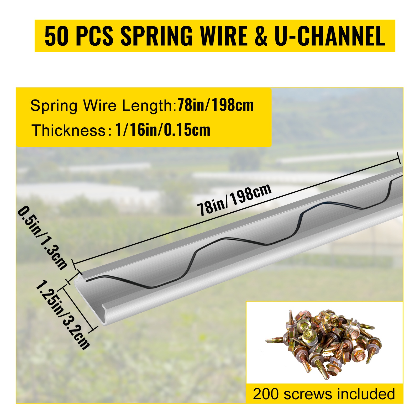 Sarjaan sisältyy 50 jousilankaa ja 50 alumiinista lukituskanavaa. Lukituskanavan koko (P x L x K): 78x1.25x0.5"/200x3.2x1.3cm, paksuus: 1/16"/1.5MM. Rakenne on tukeva ja soveltuu erilaisiin kasvihuoneratkaisuihin.