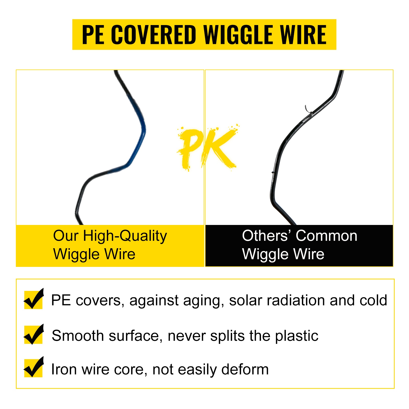 Jousilangan ydin on erikoisterästä, joka ei helposti taivu tai katkea ja kiinnittää muovin lujasti. Sileä PE-pinta kestää ikääntymistä, auringonvaloa ja kovaa pakkasta paremmin kuin PVC.