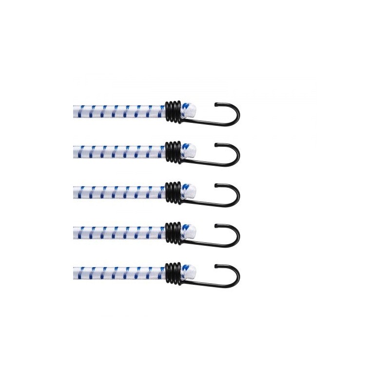 6 kappaleen joustava kuormaköysisarja, jossa on A3-teräksiset koukut ja 12 mm paksu elastinen köysi. Pituus on 72 ±1 tuumaa / 1.8 m, joten köydet sopivat hyvin esimerkiksi retkeilyyn, pressujen kiinnittämiseen, moottoripyöriin, pakettiautoihin, kuorma-autoihin ja telttoihin. Väri: valkoinen sinisin raidoin.